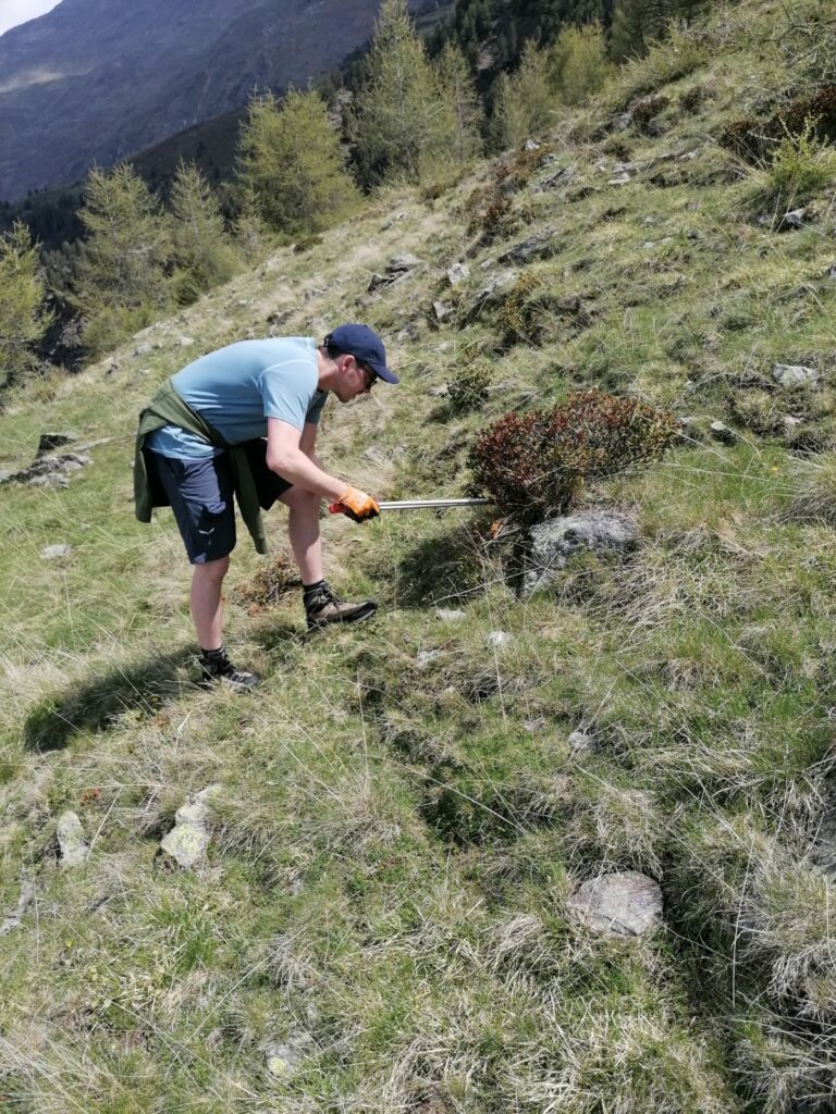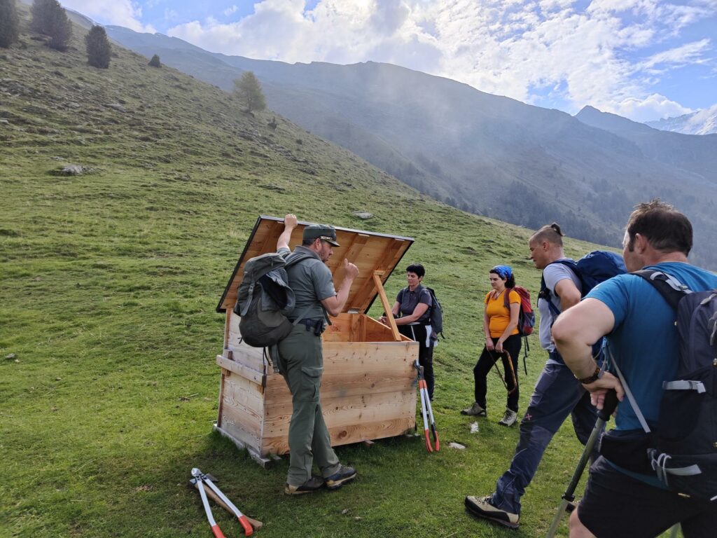 Zuletzt wurde die Organisation von der AVS-Sektion Schlanders, zusammen mit der Alminteressentschaft Schlanderser Alm und der Jägerschaft von Schlanders organisiert. Zusammen mit Klaus Bliem, Oberförster und Leiter des AVS-Referates für Natur und Umwelt, brach eine kleine, aber motivierte Truppe von AVS-Mitgliedern aus ganz Südtirol ins Schlandrauntal auf. Von dort wanderte man zum Arbeitsgebiet auf der Stierweger-Alm. Auf dem Weg dorthin erhielten die Teilnehmenden von Klaus Bliem einen kleinen Einblick in die Geschichte der Kulturlandschaft und in die Ziele der Almpflegeaktion. Bei der Kalblhütte kam die Gruppe an einem großen Kasten vorbei, in dem Material für Elektrozäune aufbewahrt wird. Wie Klaus erklärte, ist das Gebiet Teil eines Projektes zum Herdenschutz. Zwar verfügt der Hirte nicht über Herdenschutzhunde, kann aber seine Schafe bei Wolfsgefahr über Nacht einzäunen und so schützen.