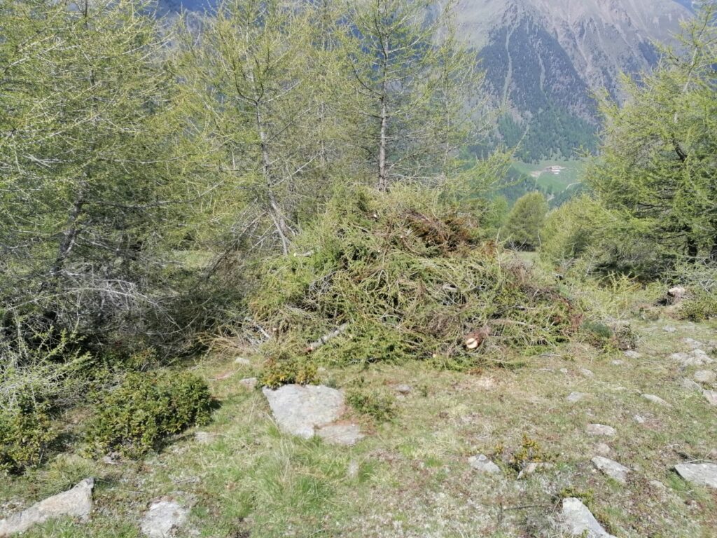Als die AVS-Gruppe am Arbeitsplatz eintraf, waren Jäger:innen und Alminteressentschaft schon an der Arbeit. Zwei Motorsägen waren in Aktion und schnitten die jungen Lärchen nieder, die begonnen hatten, die Wiese in Beschlag zu nehmen. Gemeinsam arbeitete man dran, auch die verschiedenen Zwergsträucher herauszuschneiden und das entstandene Material auf einen Haufen zu tragen. Das Wetter spielte mit: Es war nicht zu heiß und bis auf ein paar Tropfen blieb es konstant.