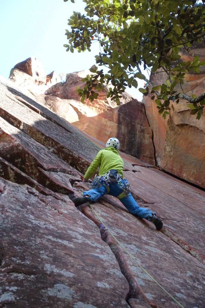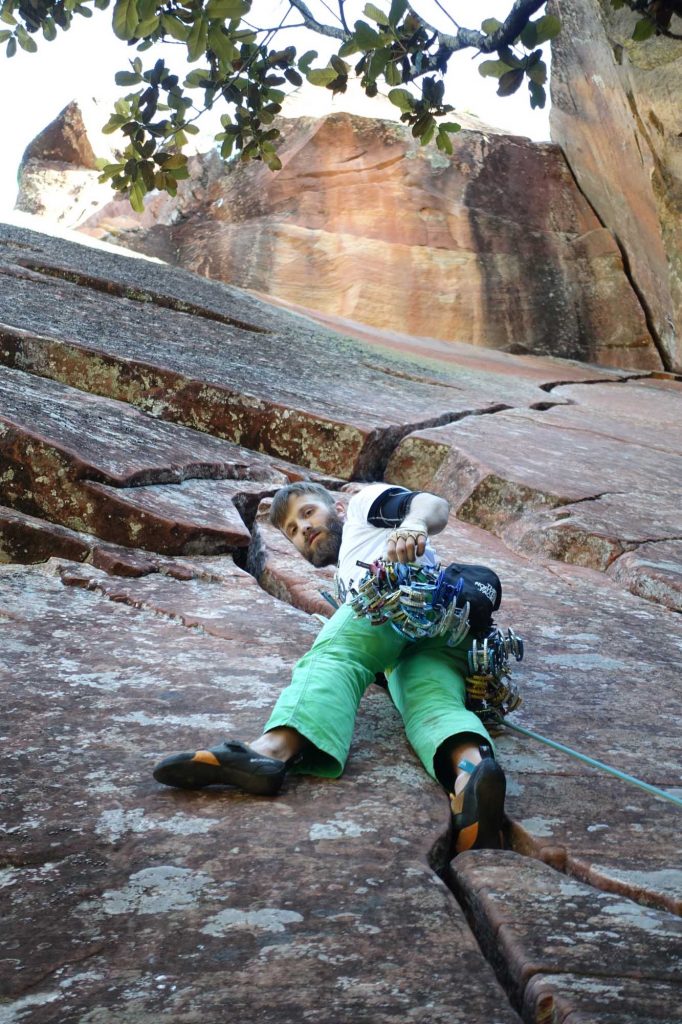 - 5. Seillänge: Ganzkörpereinsatz in einem Off Width, wo es schon mal passieren kann, dass man im Riss steckt und Hände und Füße die Wand nicht mehr berühren. Ohne Camelot Nr. 6 hat man hier einen erheblichen Runout.