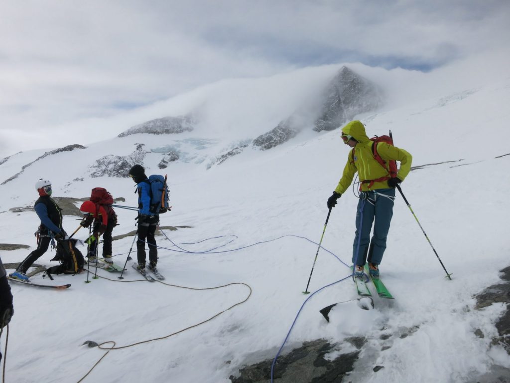 Am zweiten Tag starteten wir mit gemütlichem Schritt Richtung „Großer Geiger“. Der steile Gipfelhang forderte uns einiges an Skigeschick ab. Am Gipfel angekommen, konnten wir bereits die Kürsingerhütte, unseren nächsten Stützpunkt, sehen. Bis dorthin hatten wir aber noch ein windiges Abseilmanöver und eine Gletscherdurchquerung im dichten Nebel vor uns. Dabei konnten wir das Navigieren mit GPS-Gerät ausgedehnt üben. Eine Anfahrt mit den Skiern in der Seilschaft war auch dabei.