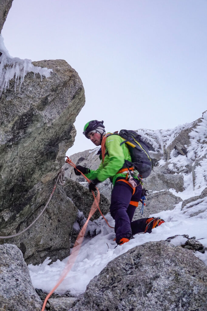 Unser Wecker klingelte am nächsten Morgen – oder besser gesagt in der nächsten Nacht – zu einer Zeit, die nur für Hochtouren angemessen war. Kurz darauf bahnten wir uns in Form einer Taschenlampenkette einen Weg durch die Dunkelheit, zunächst über den Glacier du Géant, dann in steileres, steinigeres Gelände, vorbei am bekannten Dent du Géant, dem Zahn des Riesen. Hinter unserem Rücken beleuchteten die ersten Sonnenstrahlen den Mont Blanc und rückten ihn ins Rampenlicht. Doch unser Ziel war ein anderes: der Aiguille de Rochefort. Sobald wir am Einstieg des genannten Grates waren, wurden Köpfe gelegt, Friends in Spalten gezwängt und am Sprungseil gegangen. Immer weiter, dem Gipfel entgegen. Er sollte für viele von uns der erste 4000er sein. Genauer gesagt 4001 Meter über Normalnull.