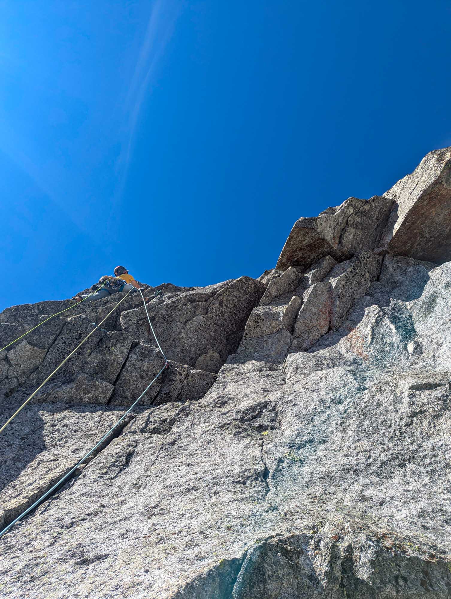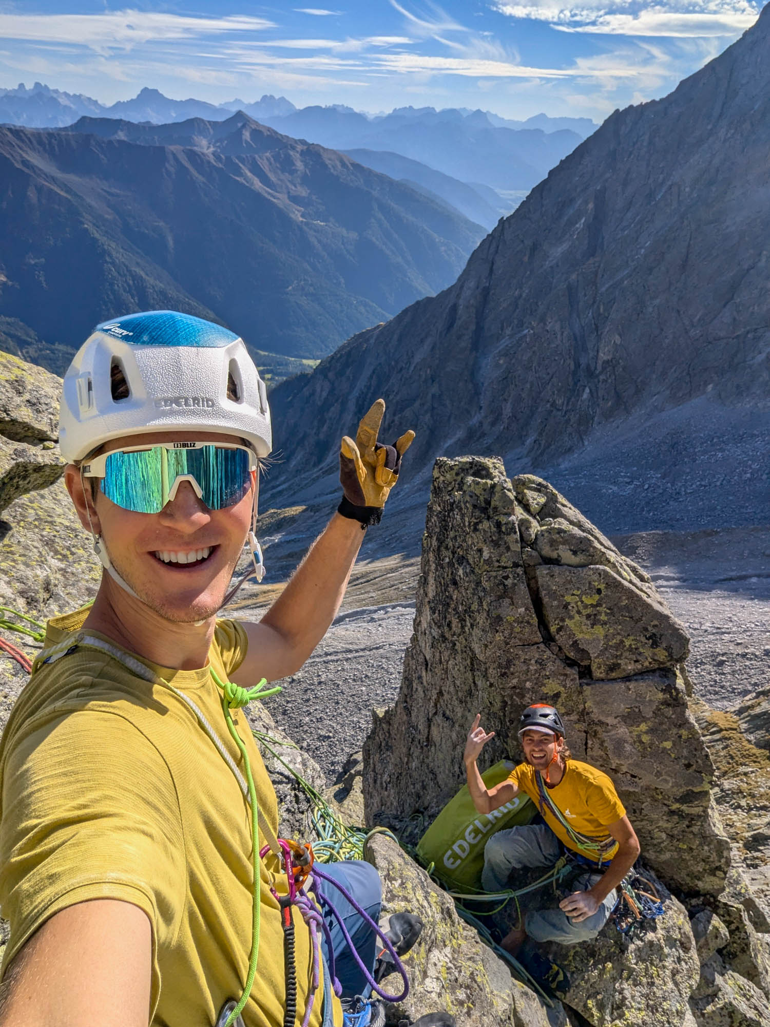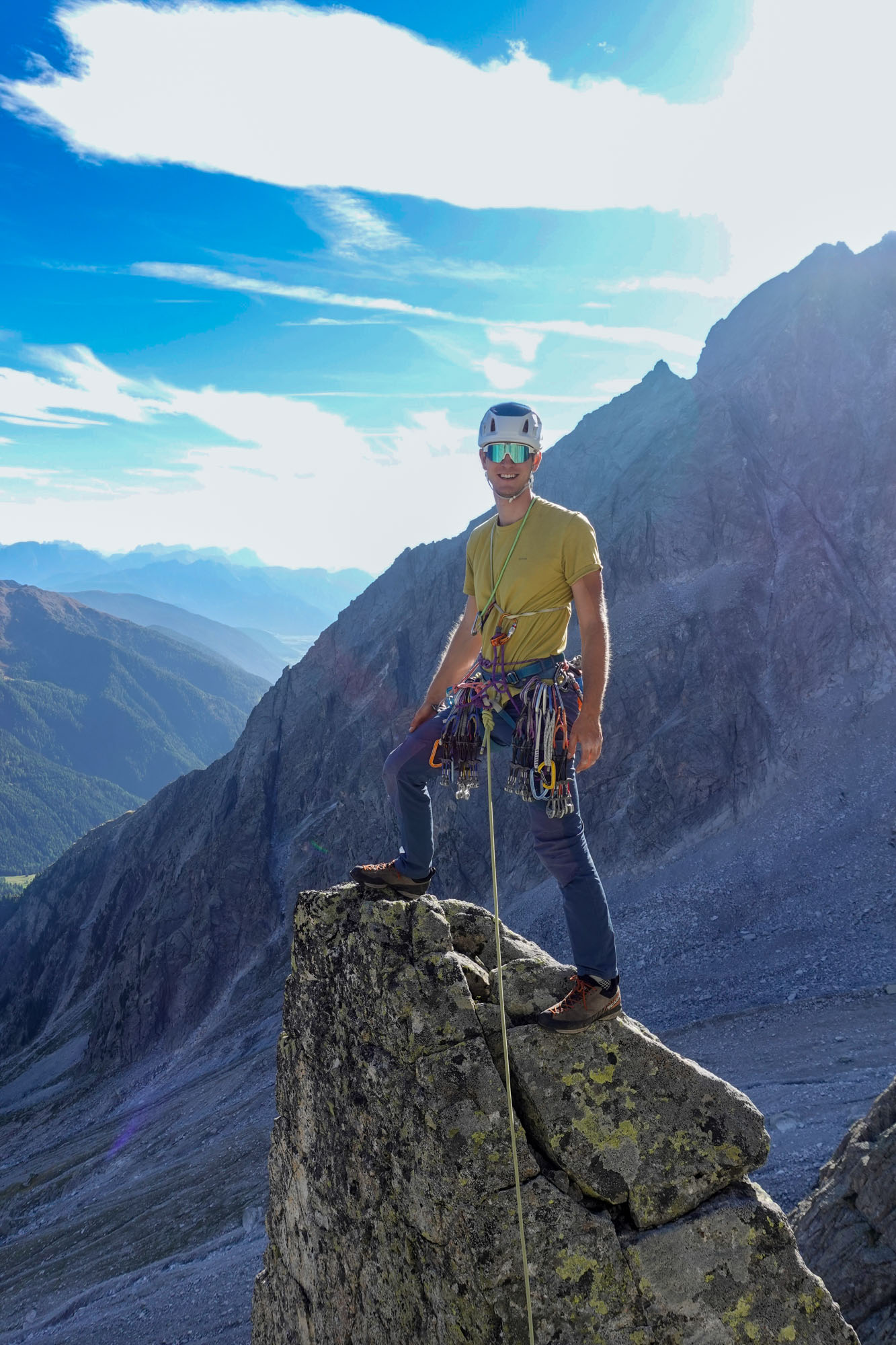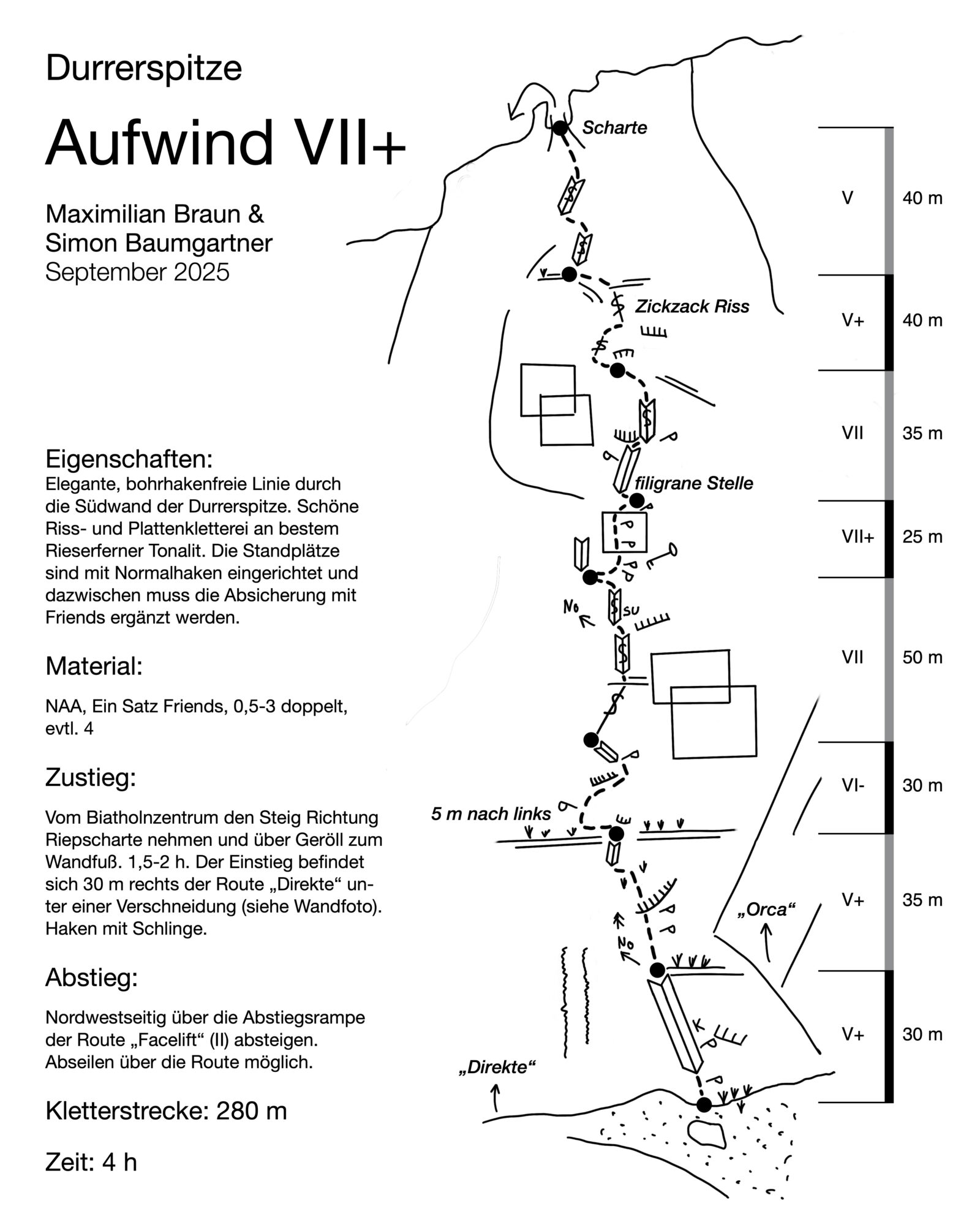 Im Sommer kletterten Simon und Max, die sich schon länger vom AVS Projekt Alpinist kannten, an der Durrerspitze, übrigens ihre erste gemeinsame Tour. Beim Abseilen wies Simon auf einen noch freien Teil der Wand hin, in dem nach genauerer Betrachtung eine schöne, logische Linie möglich schien. Voller Motivation standen wir einen Monat später, am letzten Augusttag, am geplanten Einstieg. Bei perfektem Wetter eröffnete Simon sogleich die erste Länge. Die Ungewissheit, ob wir die Linie bohrhakenfrei überhaupt schaffen würden und ob sich die Standplätze ordentlich einrichten ließen, versprach ein cooles Abenteuer. Das erste Fragezeichen war die ziemlich kompakt ausschauende Platte in der dritten Länge, aber es fand sich ein angenehmer Weg hindurch. Nach der langen und sehr abwechslungsreichen vierten Länge standen wir unter der Schlüssellänge, einer wirklich kompakten Platte. Einzig ein feiner Riss ließ auf das Unterbringen einiger Haken hoffen. Nachdem Max in einem wackeligen Cliff hängend den ersten Haken schlug, ging es, auch durch gemütliche Reggae Musik und Sonnenschein, problemlos weiter. Am Ende der Länge wartete noch einmal eine ziemlich obligatorische und ungewisse Stelle, die sich aber beherzt überwinden ließ. Nachdem der einzige Hängestand der Tour eingerichtet war, ließen wir es für den Tag gut sein und seilten ab. 3 Wochen später hingen wir, nachdem wir die Tour bis hierher frei kletterten, in ebendiesem Stand. Etwas angespannt, da dort die einzige Stelle mit ziemlich fragilem Fels liegt, ging es in die letzte schwere Länge, in der nach dem Überklettern eines tollen Daches eine fordernde Verschneidung wartete. Vorbei an einem sehenswerten Zickzack Riss gelangten wir schließlich in angenehmer Kletterei zum Ausstieg. Dieser liegt perfekt um zu Fuß absteigen zu können und obendrein wartet ein super Fotospot auf einem kleinen Pfeiler. Überglücklich darüber, dass alles so optimal klappte und über das Resultat „Aufwind“, ging unser Abenteuer nach etwas Putzarbeit beim Abseilen zu Ende.