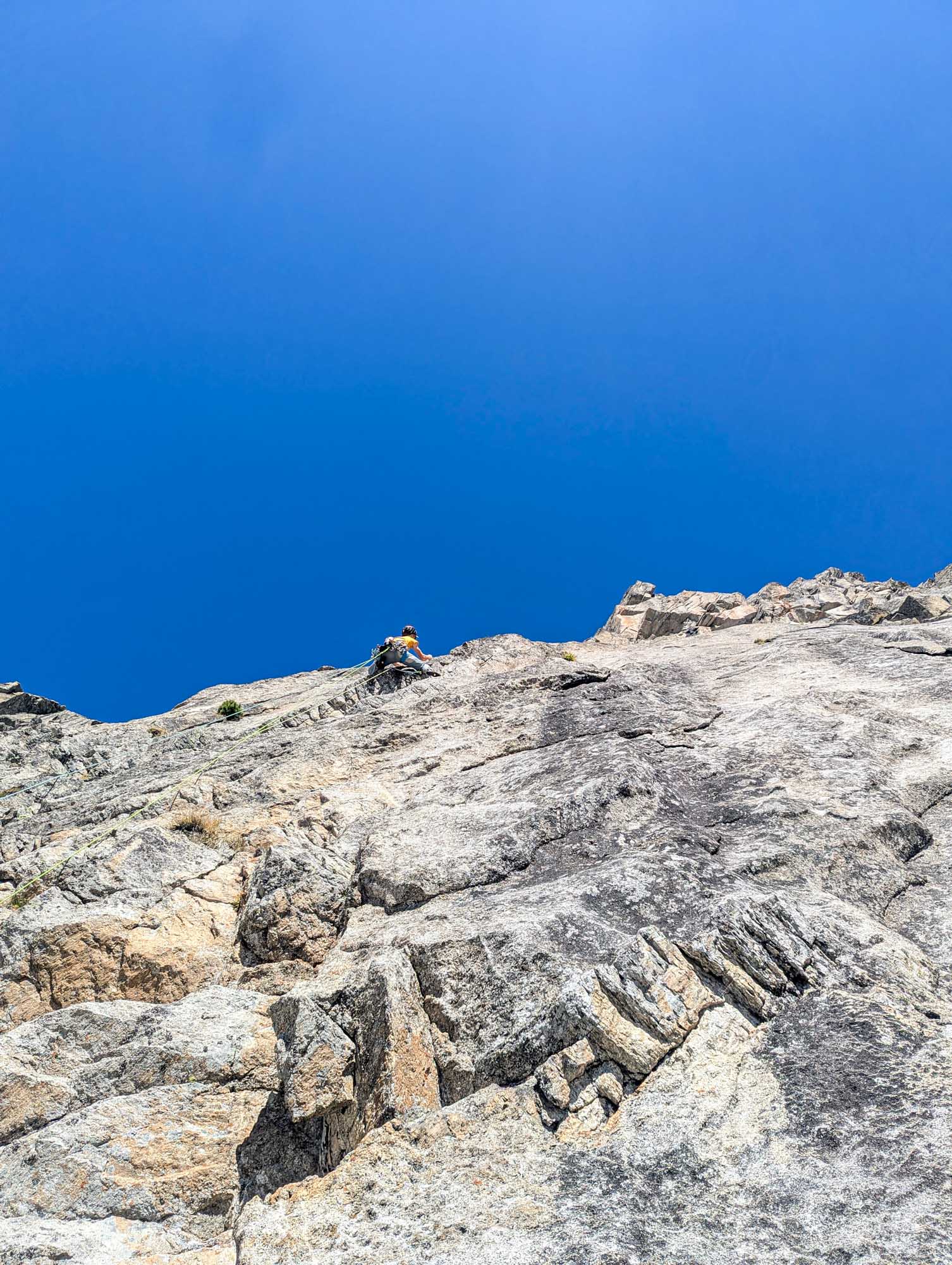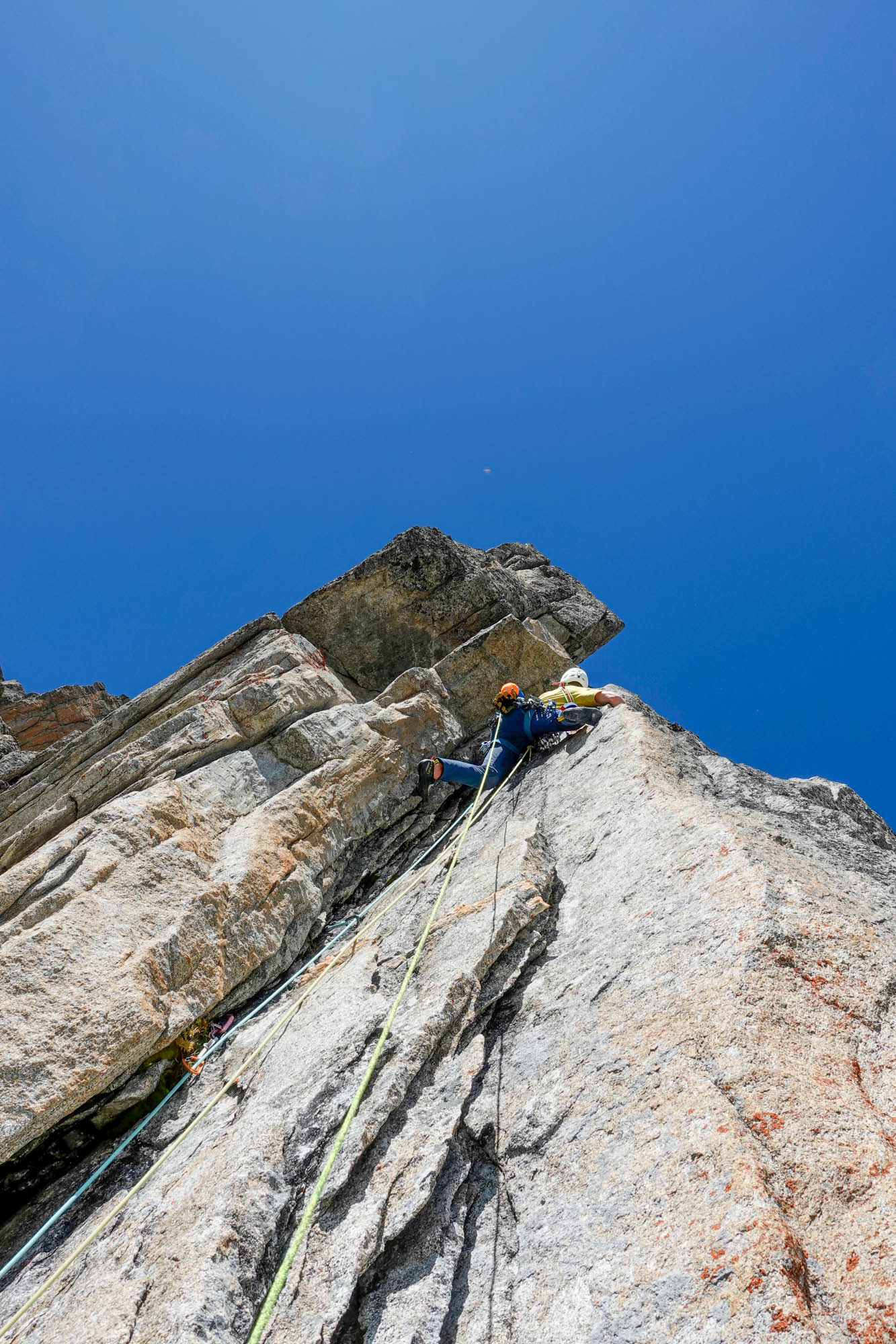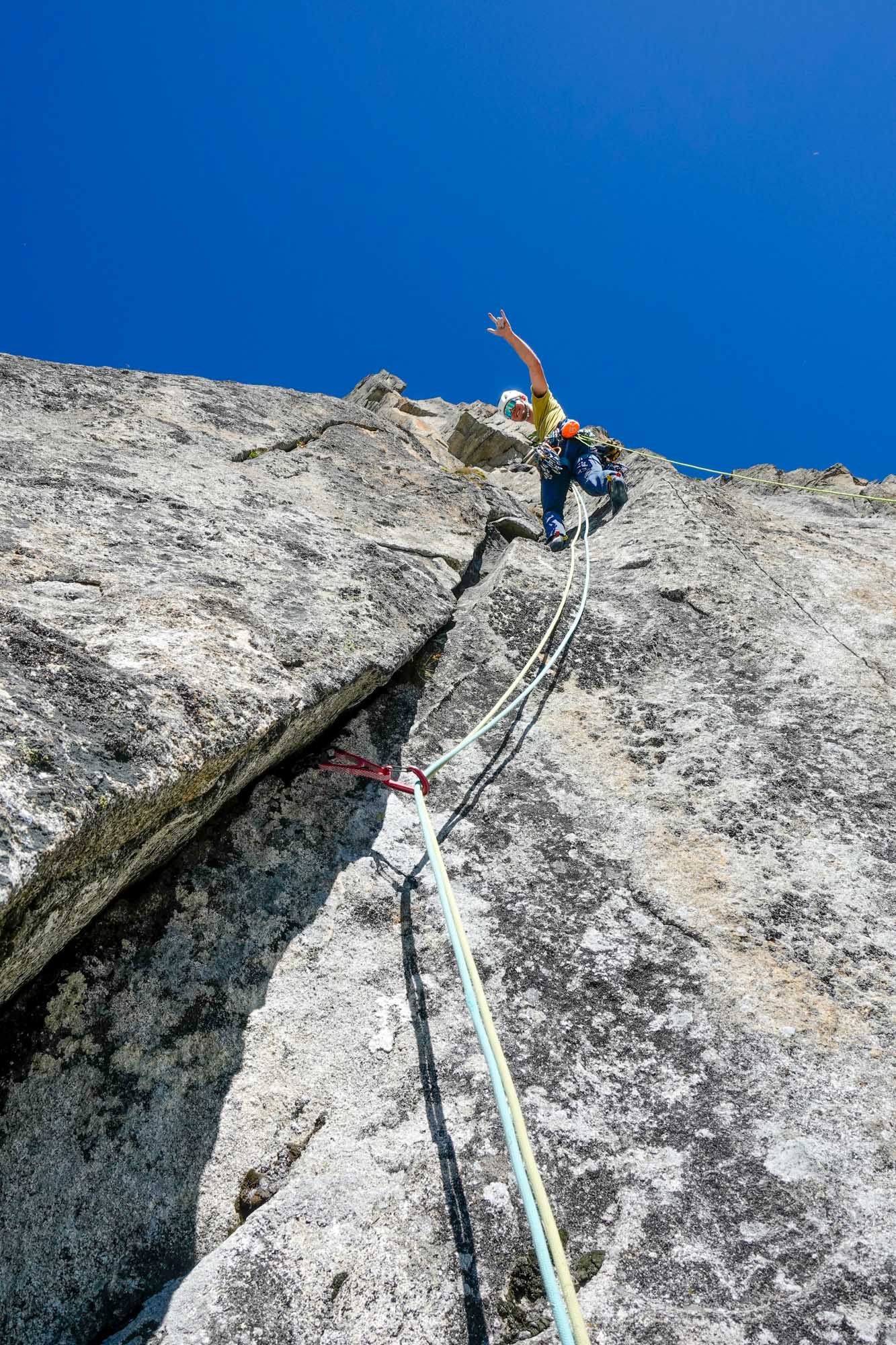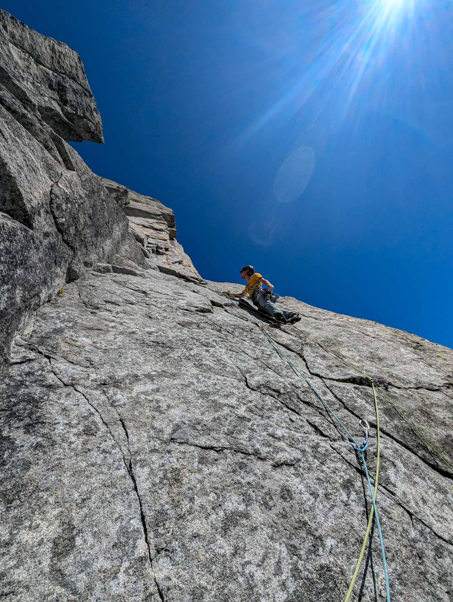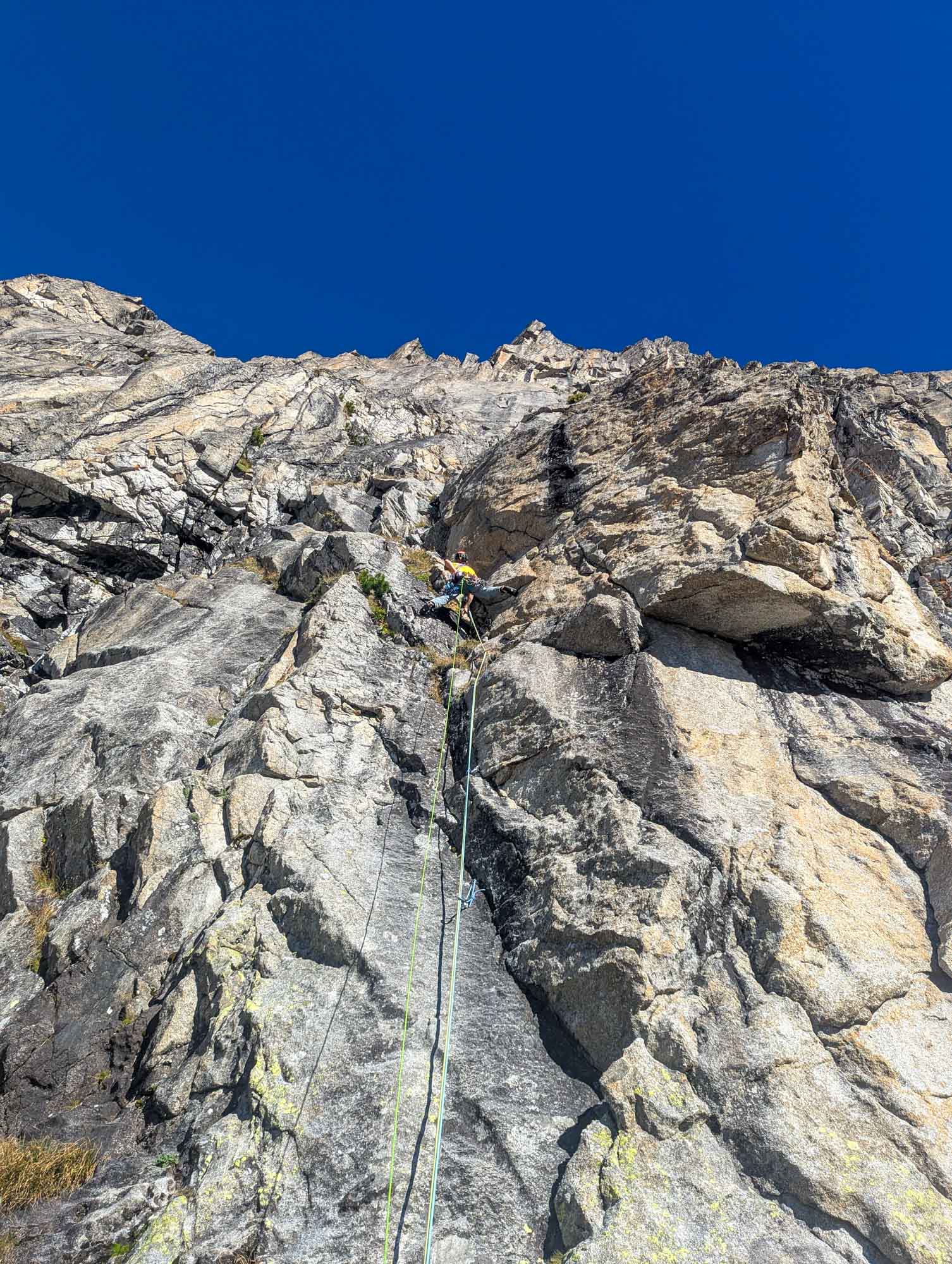 Charakter: Abwechslungsreiche und technische Kletterei über Platten, Risse, Verschneidungen und Dächer in durchgehend bomben Fels.