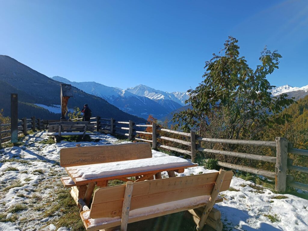 Der Parkplatz Golgabichl trägt seinen Namen vom Galgen, hier hat Matsch seine Gerichtsbarkeit ausgeübt. Hier zahlt sich jedenfalls ein kurzer Zwischenstopp oder eine Verschnaufpause aus, denn wunderbar ist der Blick zum Ortler und zu den Matscher Burgruinen.