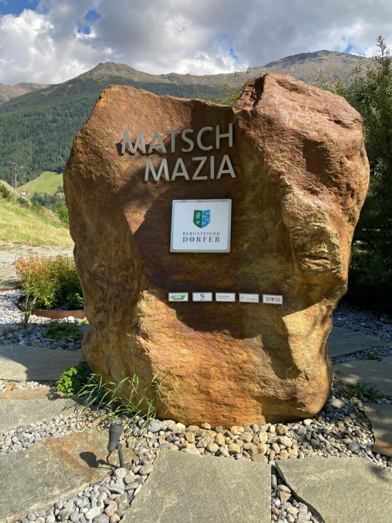 Hier befindet sich auch ein markanter rotbrauner Stein aus dem hinteren Matscher Tal. Er begrüßt alle, die hier im Bergsteigerdorf Matsch vorbeischauen und lädt ein auch länger zu bleiben, ganz nach dem Motto der Bergsteigerdörfer „Genießen und Verweilen.“