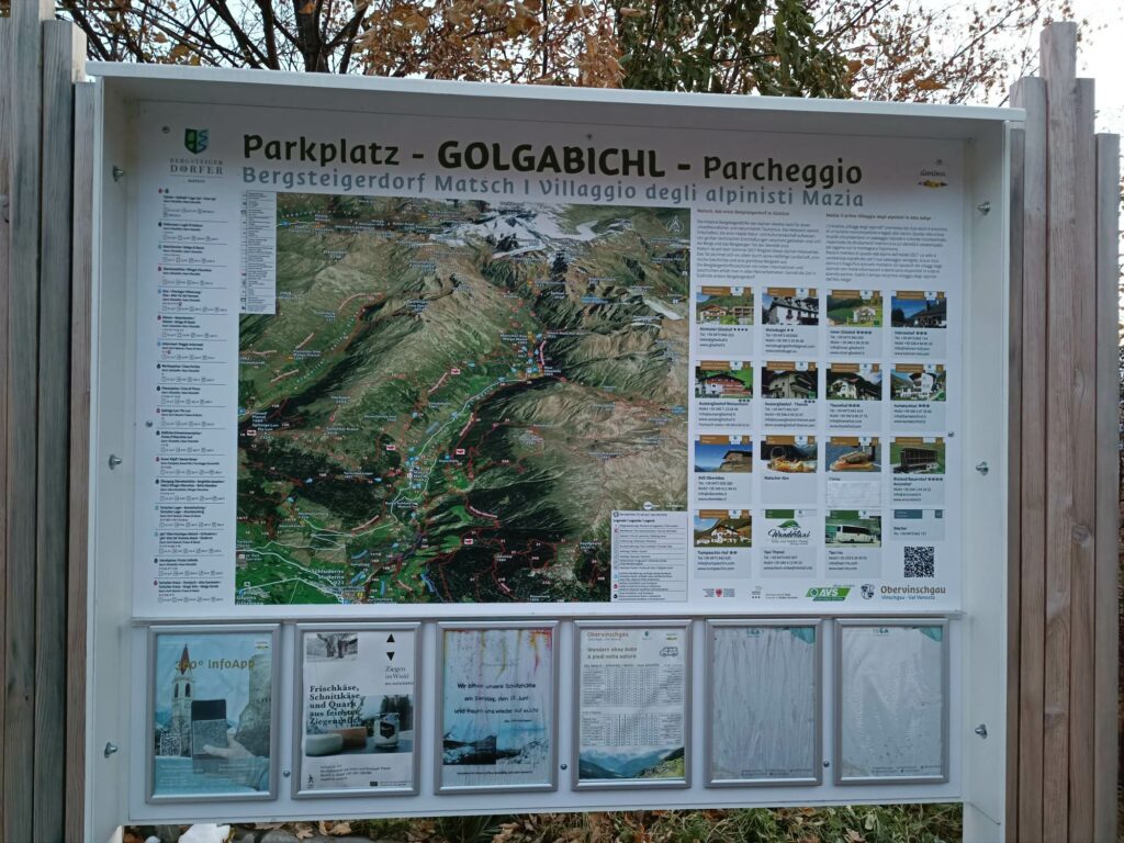 Eine Wandertafel an der Bushaltestelle informiert über die verschiedenen Tourenmöglichkeiten im Bergsteigerdorf. Hier sind auch die verschiedenen Unterkünfte und die Bergsteigerdorf-Partnerbetriebe von Matsch angeführt.
