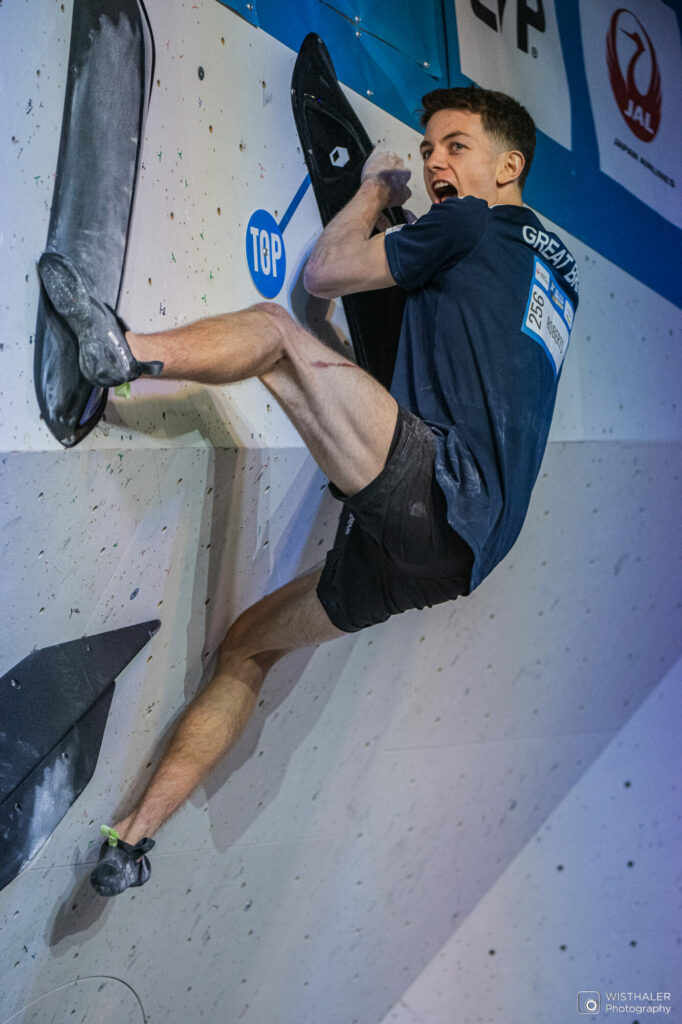Nach dem ersten Boulder deutete es sich an, dass es auf ein Duell zwischen Dohyun Lee und Toby Roberts hinauslaufen könnte. Sie waren es nämlich, die das erste Problem als einzige mit einem Top lösten. Lee glückte dabei ein Flash, Roberts benötigte vier Anläufe. Bei Boulder Nummer zwei war für die beiden Führenden in der Zone Endstation, während hier Jungspund Sorato Anraku mit einem Top zurückschlug. Der 16-jährige Japaner war beim ersten Boulder leer ausgegangen – trotzdem katapultierte er sich nun auf Rang drei vor.