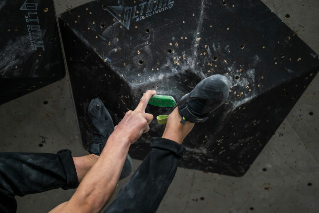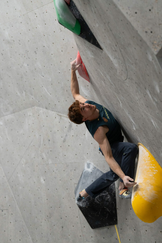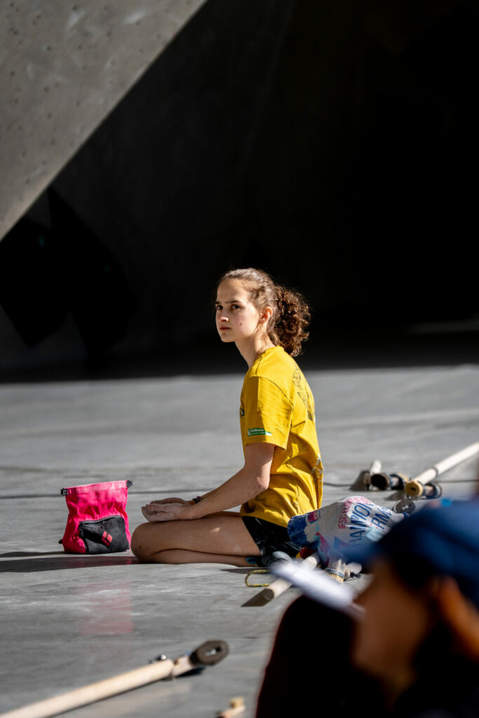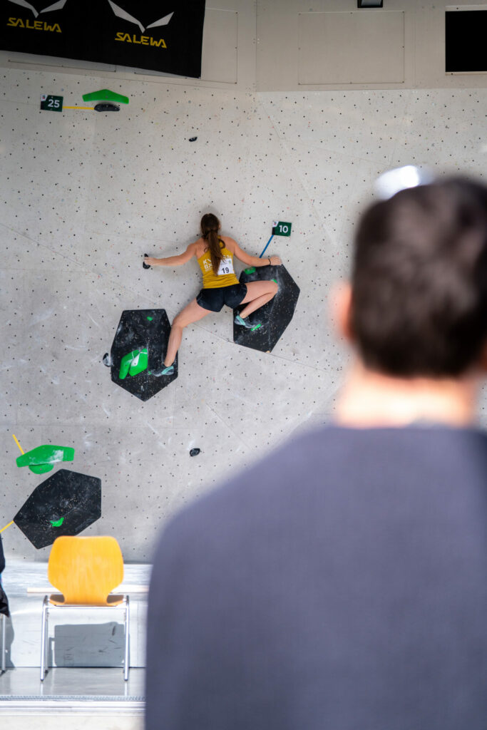 Vor dem Start steigen Konzentration und Nervosität aufs Maximum: Die Athlet:innen ziehen sich ca. eine Stunde lang in die Iso-Zone zurück – nur sie und die Trainer haben hier Zugang, Handys müssen draußen bleiben. Hier wärmen sich die Athleten für den Wettbewerb auf und bringen sich auch mental in die richtige Verfassung. „Monatelang haben wir uns auf diesen Wettkampf vorbereitet, es ist der wichtigste auf staatlicher Ebene einer jeden Saison. Athletisch sind alle fit, bei diesem Wettkampf braucht es viel Glück, aber auch psychische Stärke“, sagt Trainer Hannes Mantinger. Gemeinsam mit Morris Fontanari hat er die Südtiroler Athleten auf dieses Event vorbereitet. Sobald die Athleten aus der Iso-Zone kommen, werden sie vorgestellt – rigoros mit dem Rücken Richtung Boulderwand. Kein Blick zuviel ist erlaubt – niemand soll sich einen Vorteil verschaffen. 5 Minuten lang dürfen die Athlet:innen die Boulder besichtigen, angefasst werden darf nur der erste Griff. Die Schiedsrichter achten sehr genau darauf, dass diese Regeln eingehalten werden.