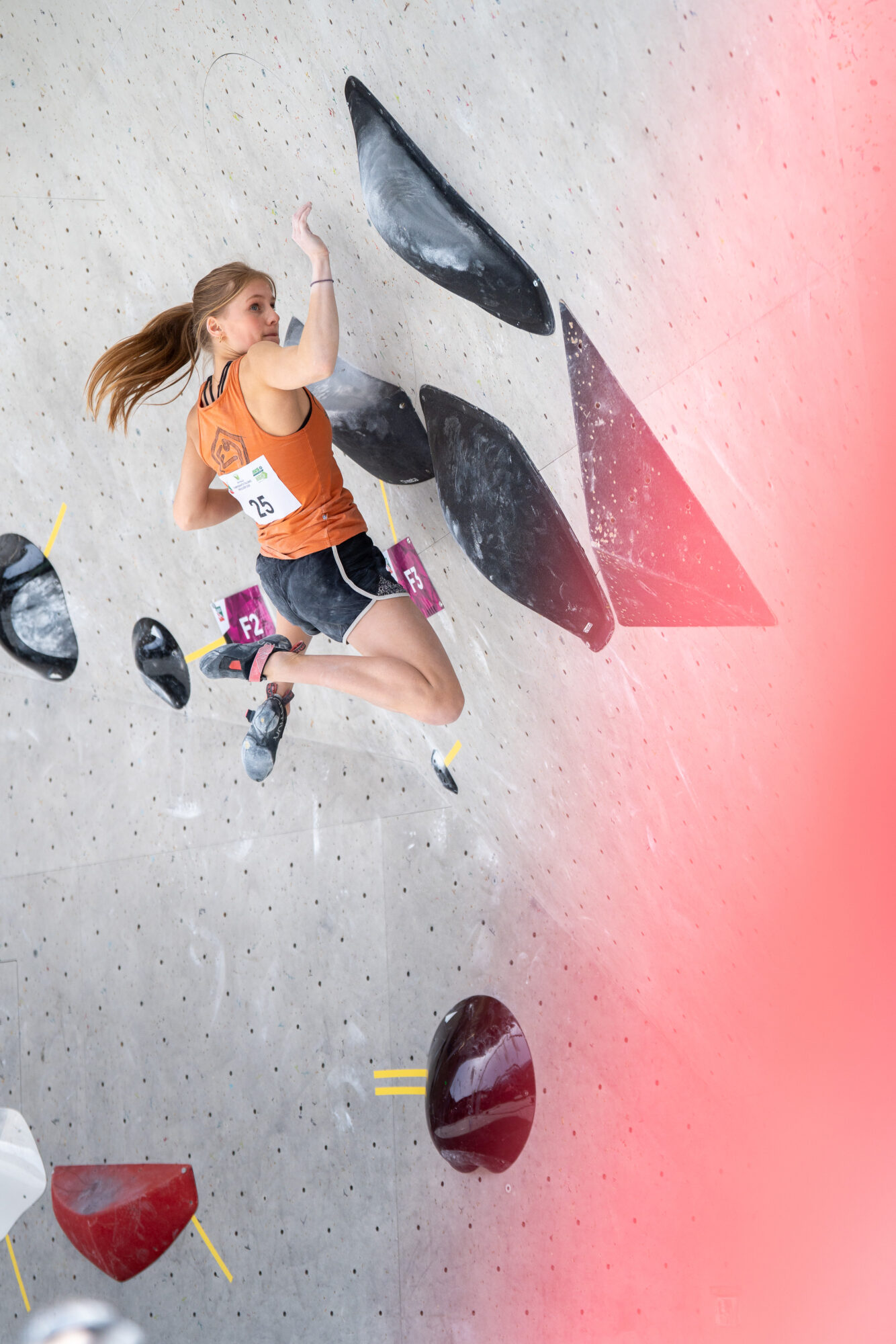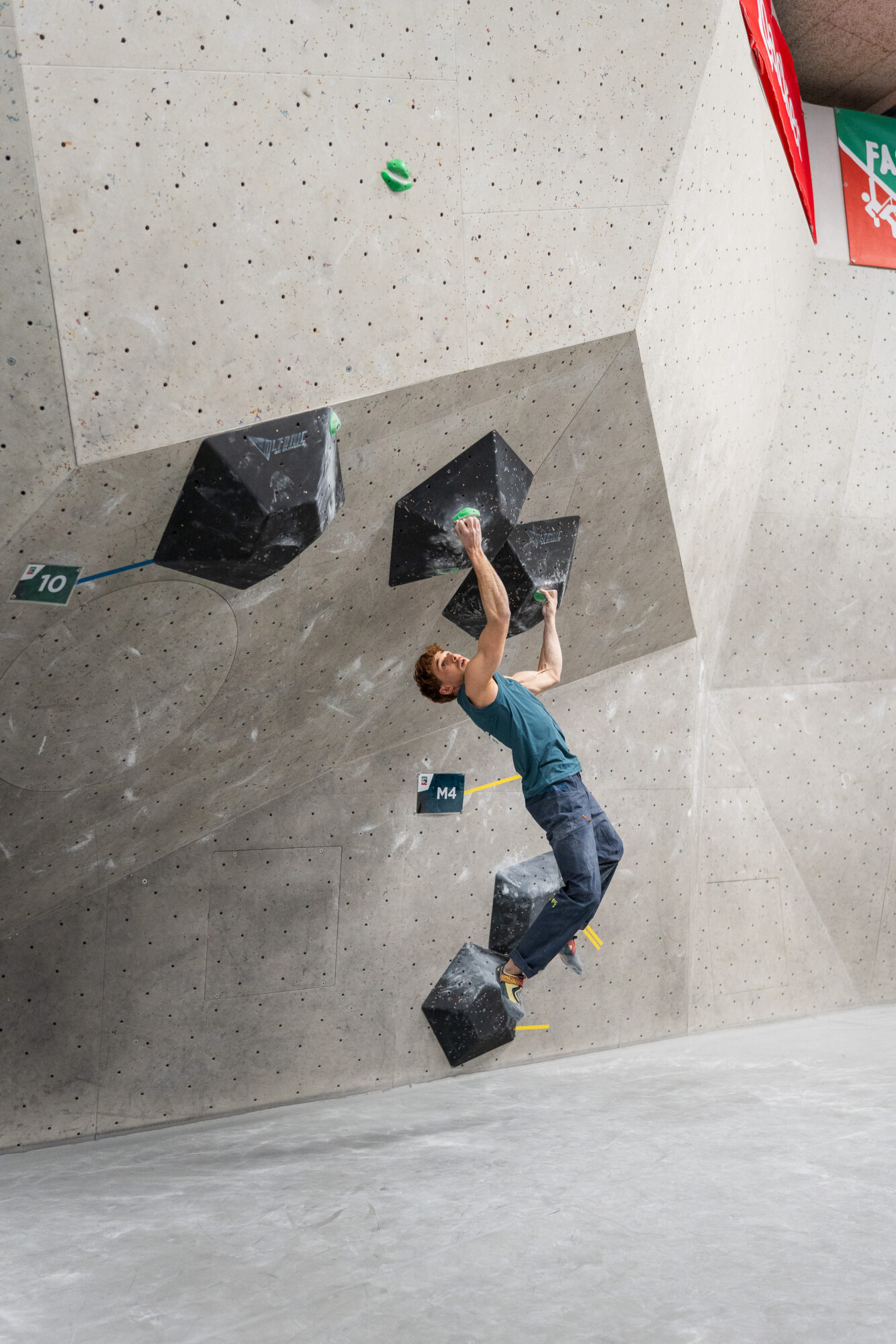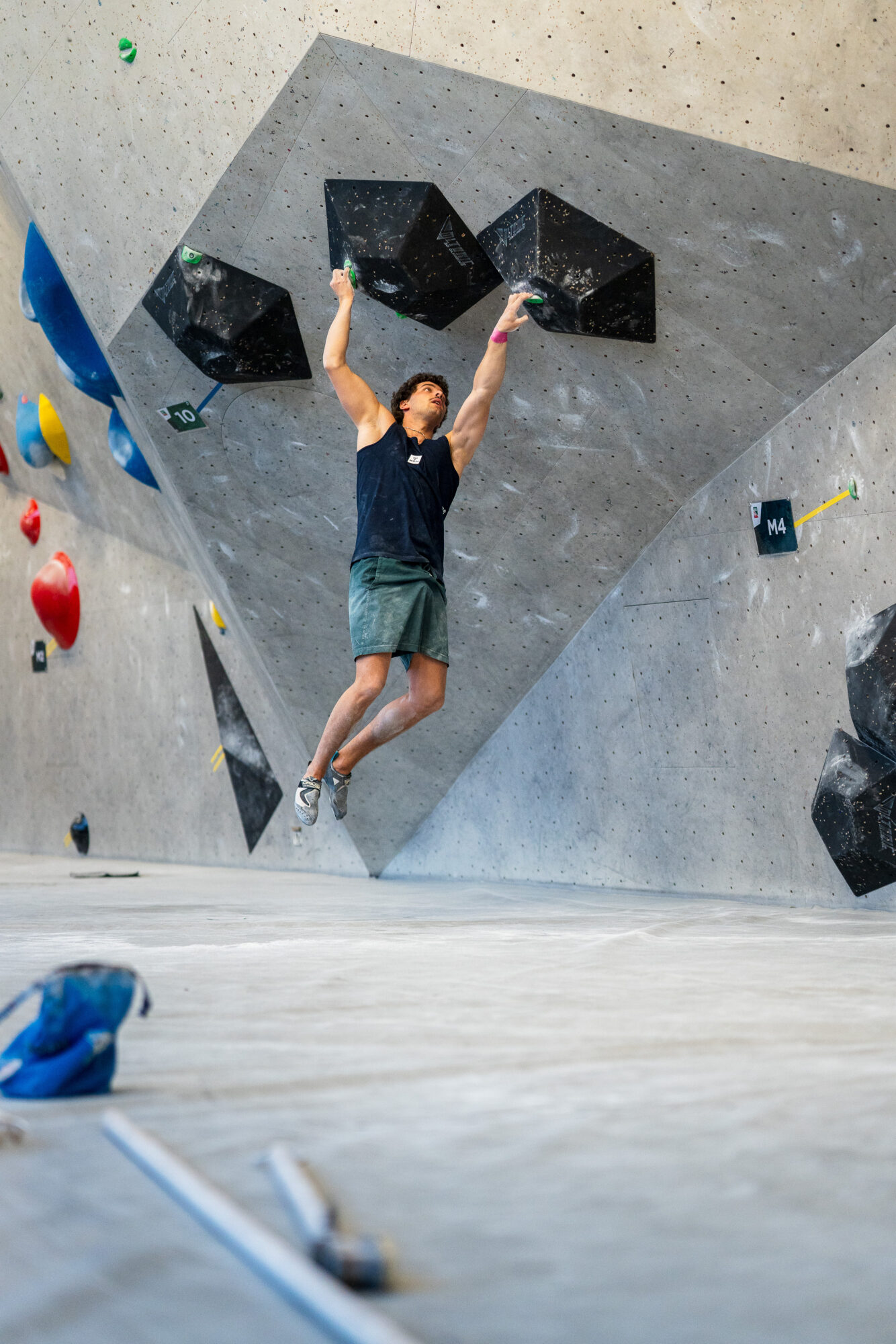 Vor dem Start steigen Konzentration und Nervosität aufs Maximum: Die Athlet:innen ziehen sich ca. eine Stunde lang in die Iso-Zone zurück – nur sie und die Trainer haben hier Zugang, Handys müssen draußen bleiben. Hier wärmen sich die Athleten für den Wettbewerb auf und bringen sich auch mental in die richtige Verfassung. „Monatelang haben wir uns auf diesen Wettkampf vorbereitet, es ist der wichtigste auf staatlicher Ebene einer jeden Saison. Athletisch sind alle fit, bei diesem Wettkampf braucht es viel Glück, aber auch psychische Stärke“, sagt Trainer Hannes Mantinger. Gemeinsam mit Morris Fontanari hat er die Südtiroler Athleten auf dieses Event vorbereitet. Sobald die Athleten aus der Iso-Zone kommen, werden sie vorgestellt – rigoros mit dem Rücken Richtung Boulderwand. Kein Blick zuviel ist erlaubt – niemand soll sich einen Vorteil verschaffen. 5 Minuten lang dürfen die Athlet:innen die Boulder besichtigen, angefasst werden darf nur der erste Griff. Die Schiedsrichter achten sehr genau darauf, dass diese Regeln eingehalten werden.