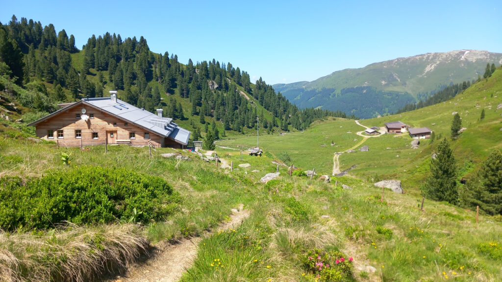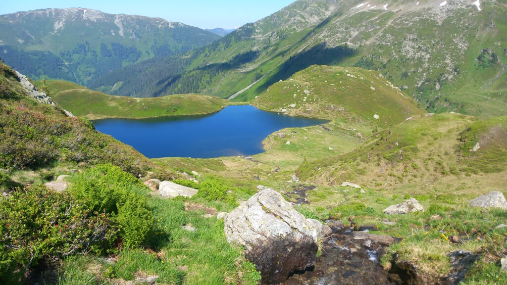 Stichwort Sommer: dann bricht auch die Zeit der jüngsten Bergfans an, für die die Umgebung der Neuen Bamberger Hütte ein wahrhaft riesiger Abenteuerspielplatz ist. Während die Eltern auf der großen Terrasse der Hütte in der Sonne sitzen und ein Auge auf den Nachwuchs werfen können, kann dieser auf den leicht hügeligen Wiesen und dem nahen Bachlauf nach Herzenslust planschen und toben. Der relativ leichte Hüttenzustieg ist für Kinder gut zu schaffen, die Abgeschiedenheit und ruhige Lage der Hütte sorgen bei den Eltern für erholsame Aufenthalte. Auch die Wanderungen zu den drei nahen Wildalmseen mit eiskaltem – manche sagen auch erfrischendem – Wasser, sind Highlights für Klein und Groß. Wer will kann hier seine Fähigkeiten im „Steinblattln“ unter Beweis stellen (oder noch daran feilen). Wem das noch nicht reicht und mit den Kindern Gipfelluft schnuppern will, kann auch die umliegenden Gipfel besteigen. Die Wanderwege sind leicht und nicht exponiert , die Aufstiege selbst mit 600-700 Höhenmetern in zwei bis drei Stunden für die meisten Altersgruppen gut zu bewältigen. Die große Auswahl an Wanderungen, die man von der Hütte aus starten kann, laden dazu ein, mehrere Tage auf der Hütte zu verbringen, ohne dass Langeweile bei jung oder alt aufkommt.