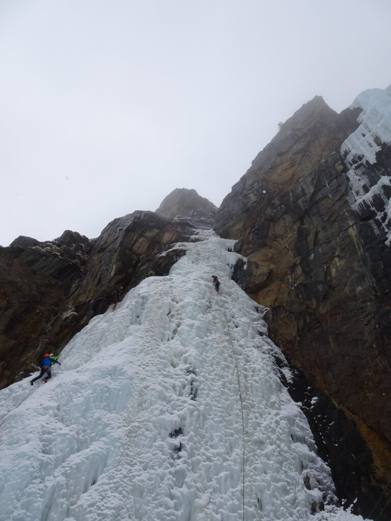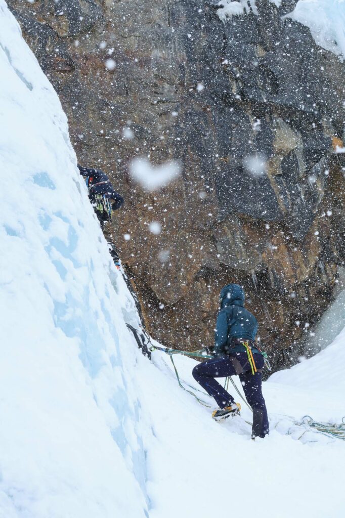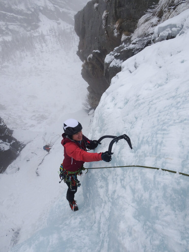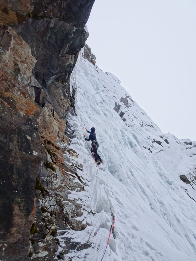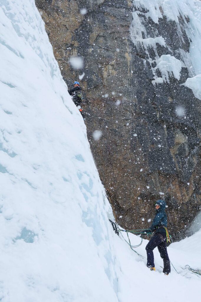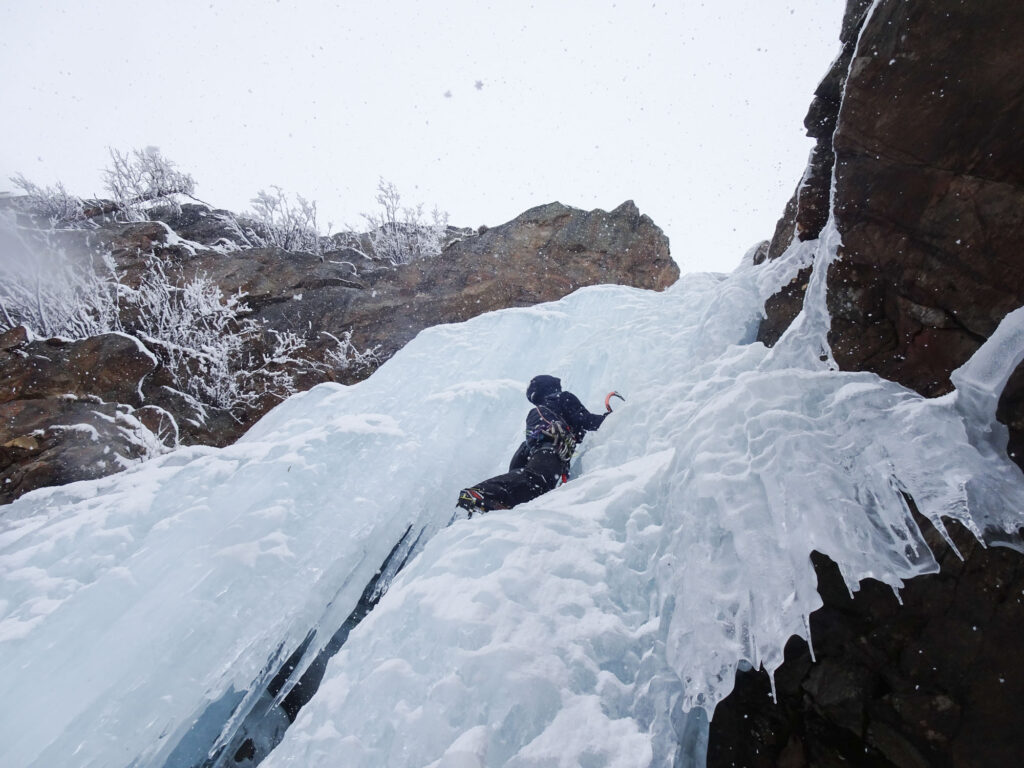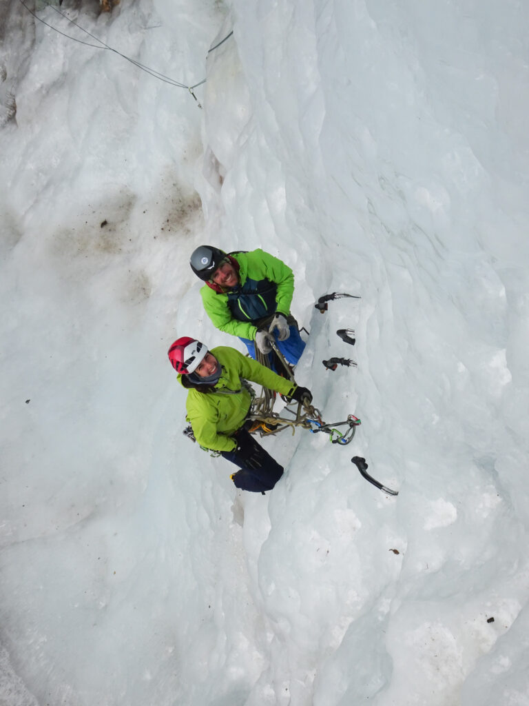 Wie kräftezehrend das Eisklettern ist, merkten wir in diesen Tagen besonders. Am Ende der Tage war von unserem gewohnten Redefluss meistens nicht mehr viel übriggeblieben. Die Tipps und Tricks und die tägliche mehrstündige Praxis im Pickeln machten uns mit der Sportart jedoch viel umgänglicher und vertrauter. Unsere Leidenschaft zum Bergsport war auch von stürmischem Schneefall, nassen Klamotten und gepumpten Unterarmen nicht zu bremsen. Gefüllt mit neuen Erfahrungen und Erkenntnisse waren wir gedanklich bereits wieder auf Tour zum nächsten Abenteuer.