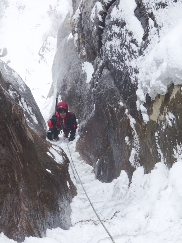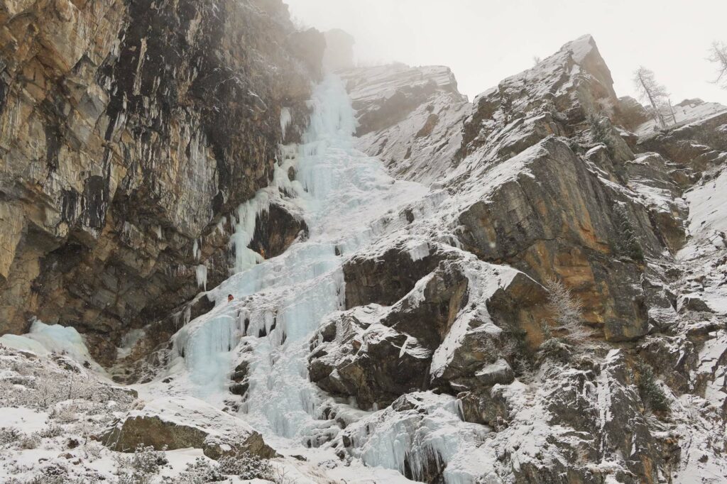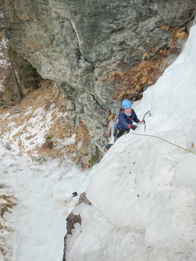 Die Wetterprognose für den dritten Tag war leider nicht so gut, was sich bald bestätigte, als wir um 7 Uhr morgens das Haus bei strömendem Regen verließen. Wir ließen uns nicht abschrecken und machten uns auf zum nächsten Abenteuer. In Cogne angekommen stellten wir bald fest, dass es nachtsüber mehr geschneit hatte, als erwartet. Ein Ende war nicht in Sicht. Wir entschieden uns dazu, die Eisfälle des vorigen Tages zu tauschen und machten uns wieder auf den Weg ins Valnontey. Beim Eisklettern wurden wir von Schneemassen, Spindrifts und nassen Klamotten auf die Probe gestellt. Einen Vorteil hatte der viele Schnee jedoch. Den steilen Zustieg zum Wasserfall konnten wir heimwärts in eine Rutschpartie verwandeln.