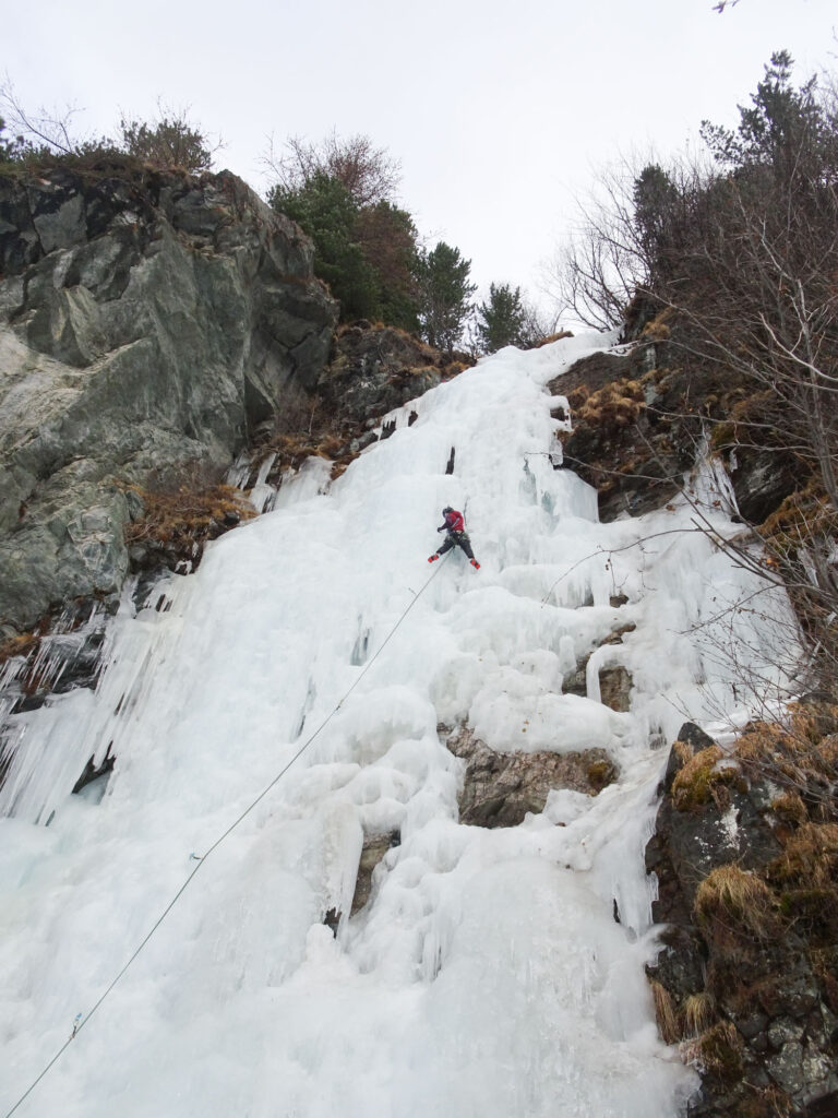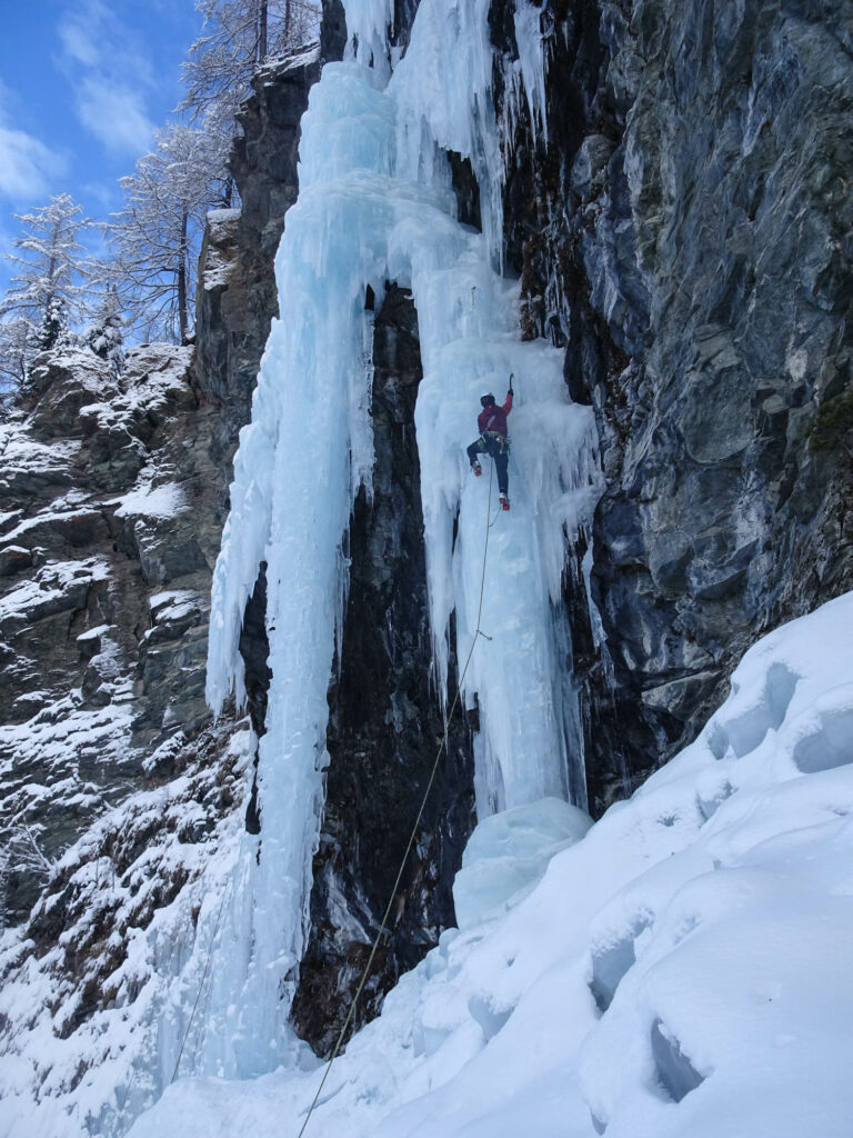 Dank der milden Temperaturen ließ sich das Eis hervorragend klettern. Seillänge für Seillänge kämpften wir uns an den anderen Seilschaften vorbei nach oben und schon bald konnten wir unseren ersten richtigen Tourenerfolg in Cogne feiern. Gegen Tagesende machten wir uns wieder auf den Weg talauswärts, wo wir uns in der Bar wiederfanden. Müde, aber zufrieden ließen wir den Tag bei Spaghetti Carbonara und Bier ausklingen.