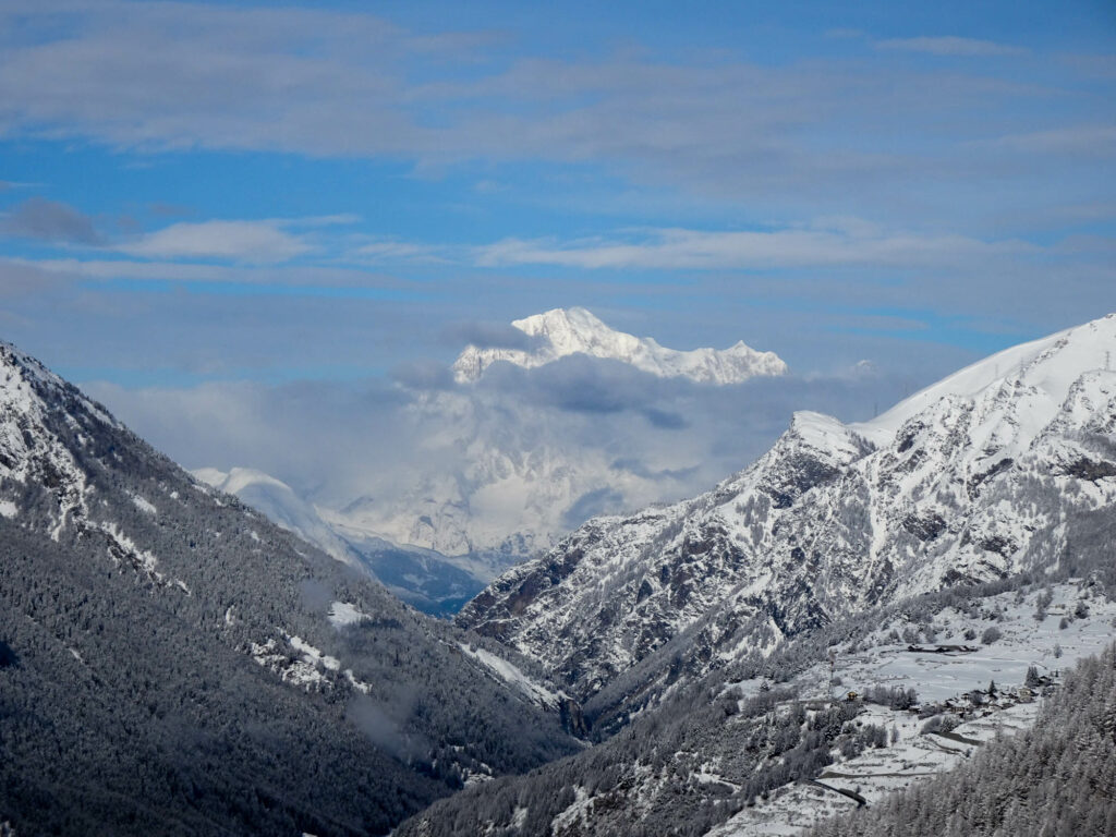 Am letzten Tag bekamen wir dann endlich Aosta und den Mont Blanc zu sehen. Das schlechte Wetter ist pünktlich mit uns abgereist. Für den Sonntag suchten wir uns einen Eisfall mit wenig Zustieg, der jedoch etwas schwieriger und steiler zum Klettern war. Im Vor- und Nachstieg nutzten wir die letzten Stunden noch aus, bevor wir uns erschöpft auf die Heimreise machten.