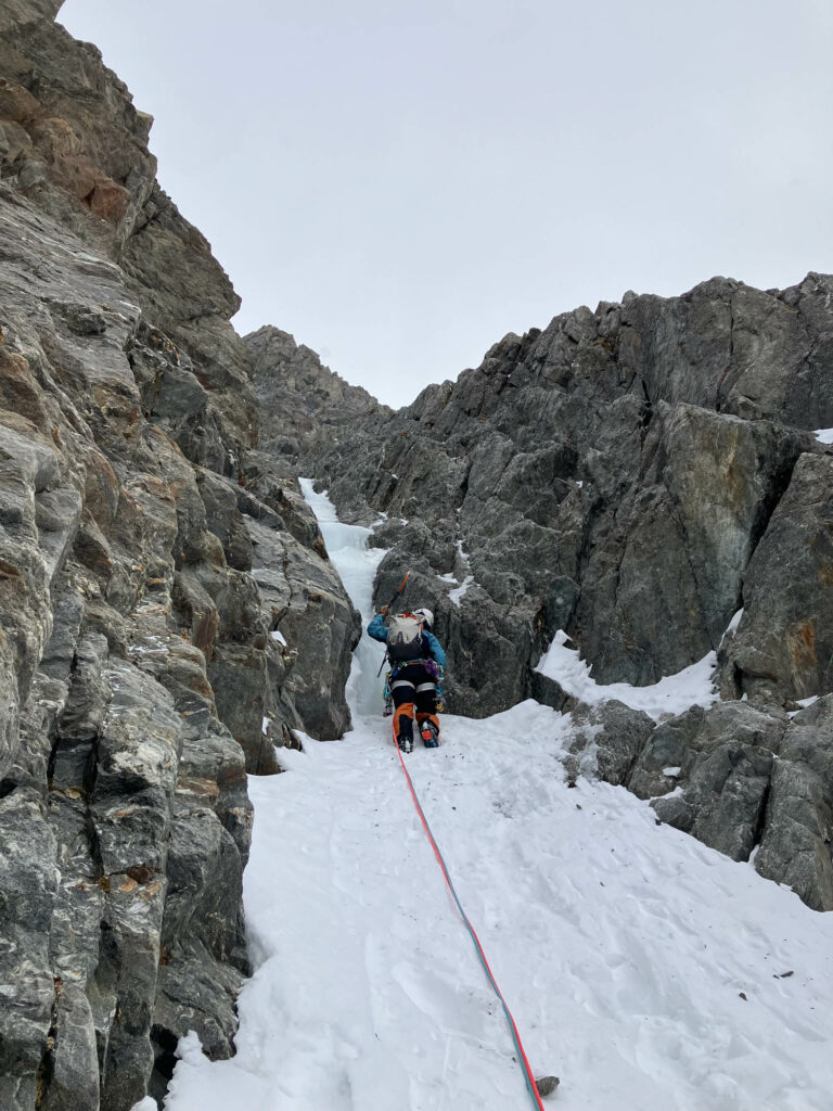 Charakter: Abenteuerliche mixed Nordwand, die ganze Tour ist selber mit mobilen Sicherungsmitteln abzusichern. Die Tour führt über eine Reihe von Couloirs/Kamine durch den steilsten Wandteil. Die Bedingungen müssen passen, bei unserer Begehung haten wir im mittleren Wandteil zu wenig Schnee und Eis, sodass wir in SL 3 ohne Eisgeräte kletterten. Aber in der 1. SL hatten wir durch den Schneemangel einen schönen Eisfall. Der Fels ist überall relativ gut, besonders in der 2. SL, und die letzte SL ist ein wenig blöckig.