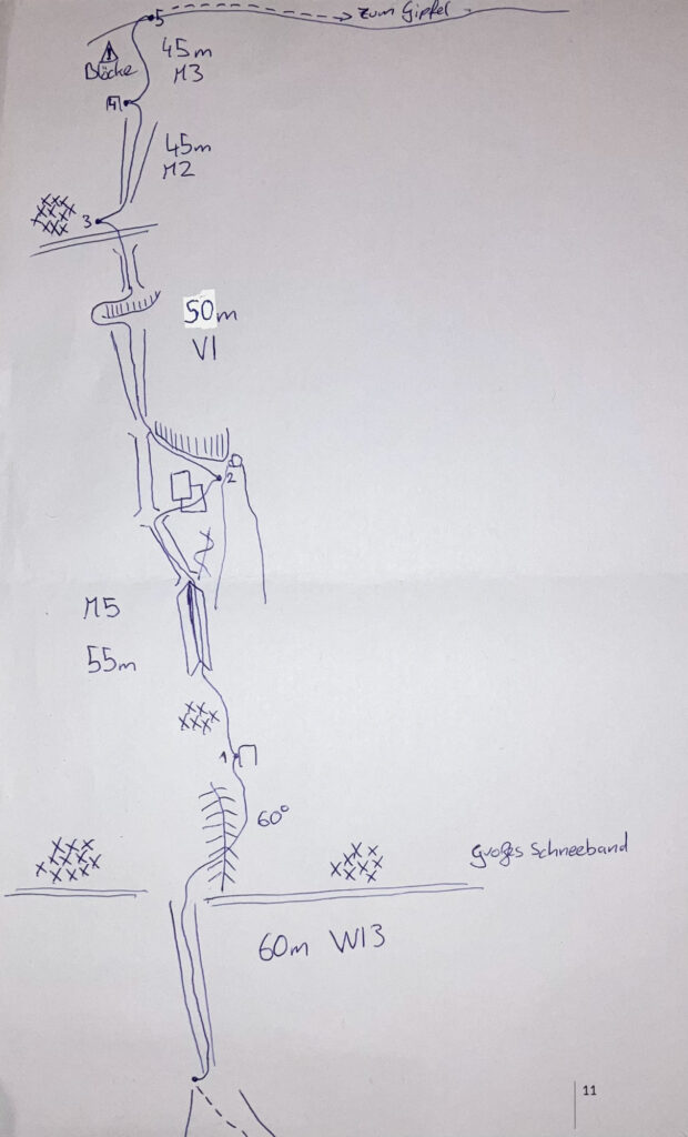 Aufgrund von mangelndem Schnee wurde ohne Eisgeräte geklettert. Vom Stand aus nach links über gestufte Rampe wieder in Rinne queren. Der Rinne folgen bis man einen Aufschwung erreicht, dort die kleinen Dächer über Kamine erklettern. Auf einem Schneefeld angekommen