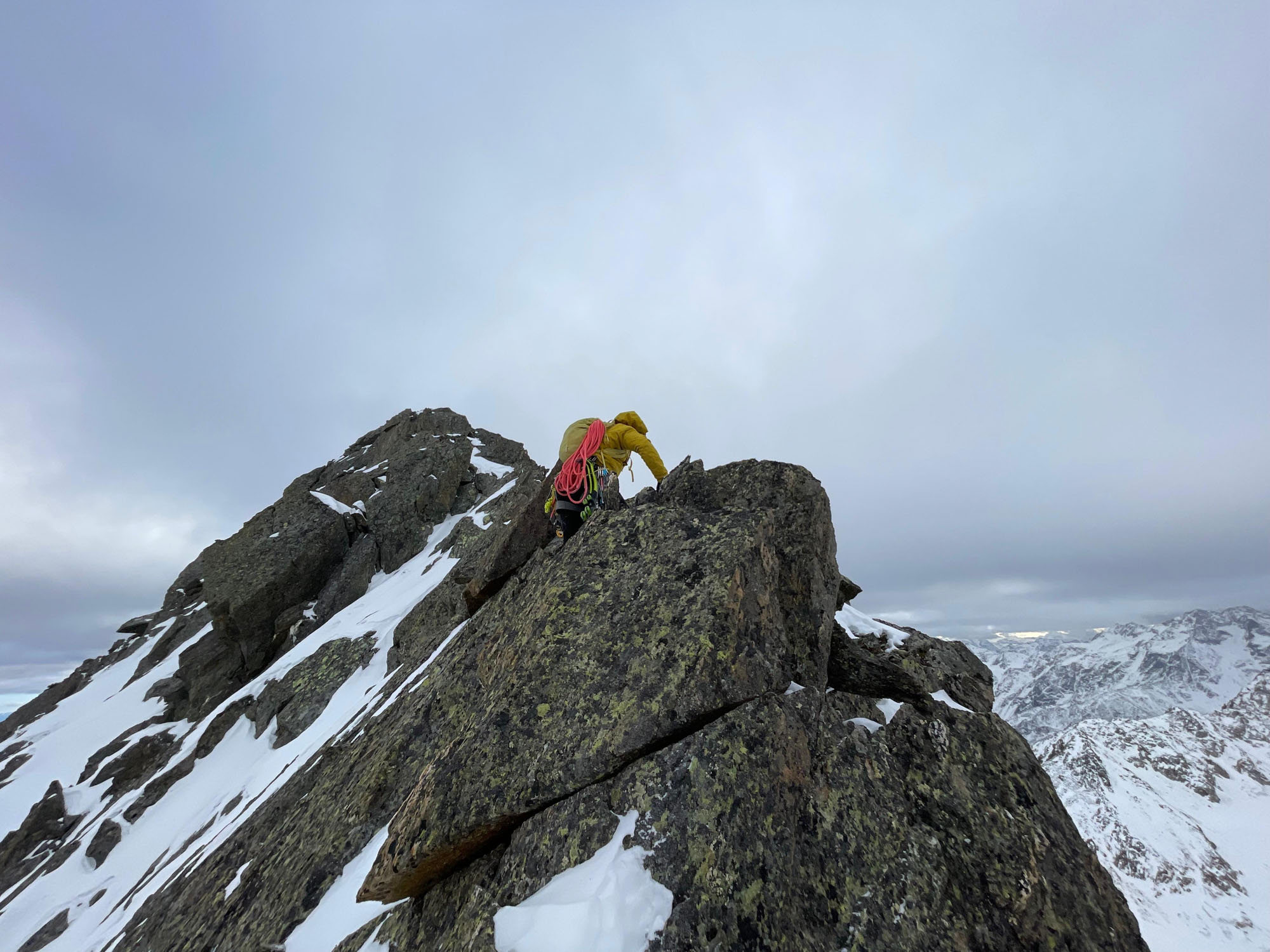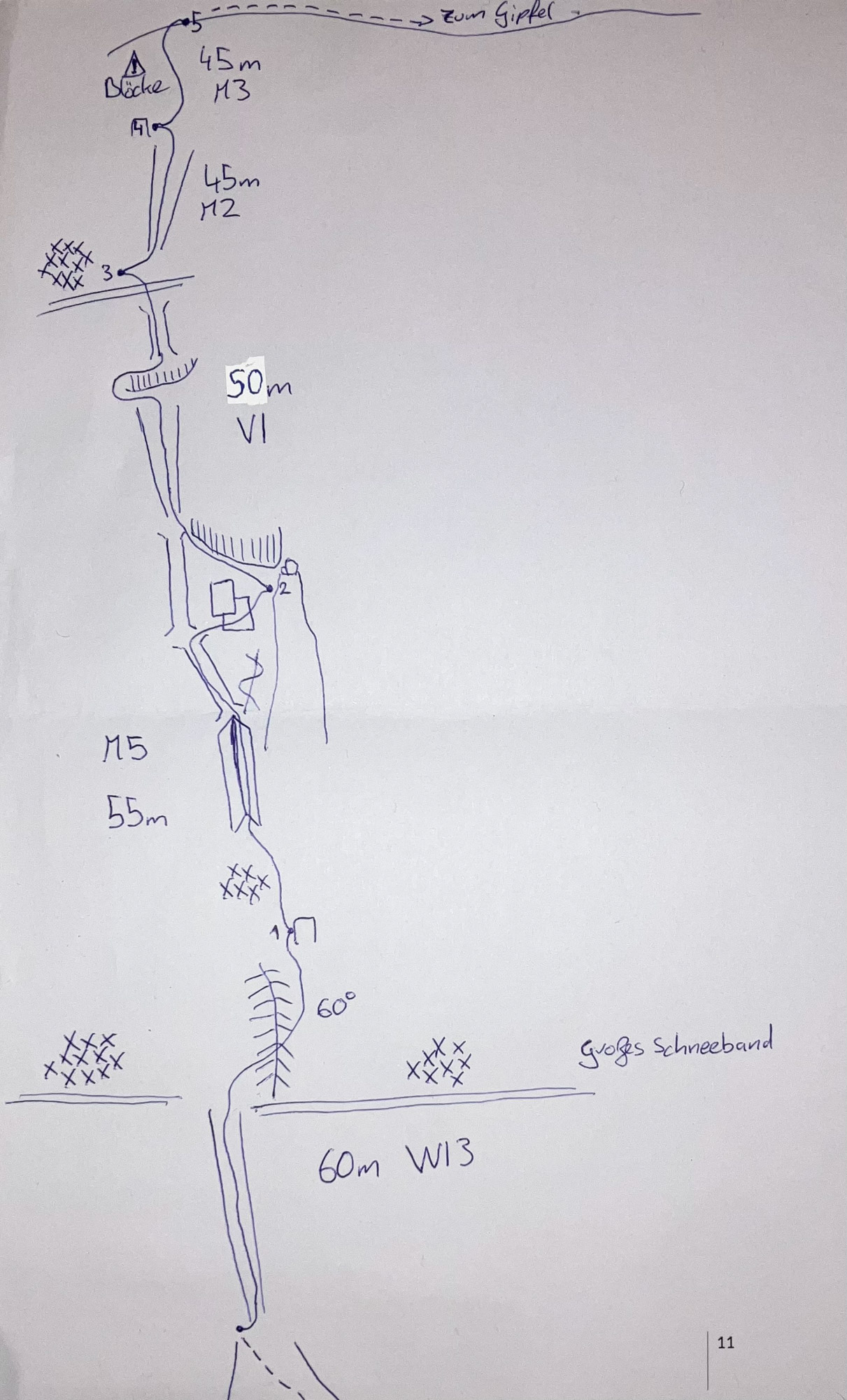 Charakter: Abenteuerliche mixed Nordwand, die ganze Tour ist selber mit mobilen Sicherungsmitteln abzusichern. Die Tour führt über eine Reihe von Couloirs/Kamine durch den steilsten Wandteil. Die Bedingungen müssen passen, bei unserer Begehung haten wir im mittleren Wandteil zu wenig Schnee und Eis, sodass wir in SL 3 ohne Eisgeräte kletterten. Aber in der 1. SL hatten wir durch den Schneemangel einen schönen Eisfall. Der Fels ist überall relativ gut, besonders in der 2. SL, und die letzte SL ist ein wenig blöckig.