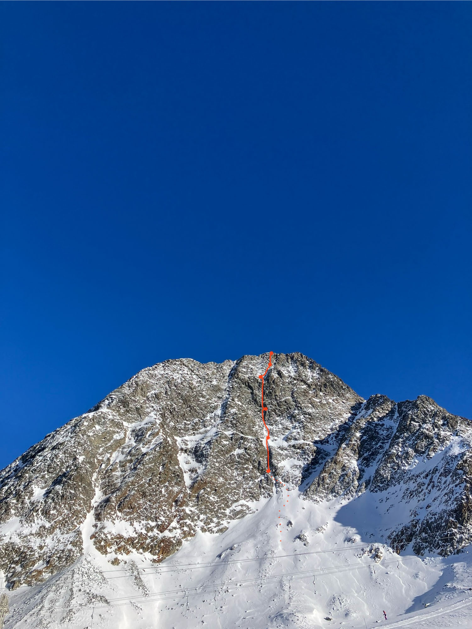 Zustieg: Ins hinterste Schnalstal nach Kurzras, dort die Schnalser Gletscherbahn nehmen und bestenfalls mit den Skiern zum Finaillift, dort kann man auffellen oder den Lift nehmen. Der Ausgangspunkt befindet sich kurz über der Talstation des Finaillifts. Von Dort aus richtung kleinem Couloir mit Eis aufstreigen.(70°)