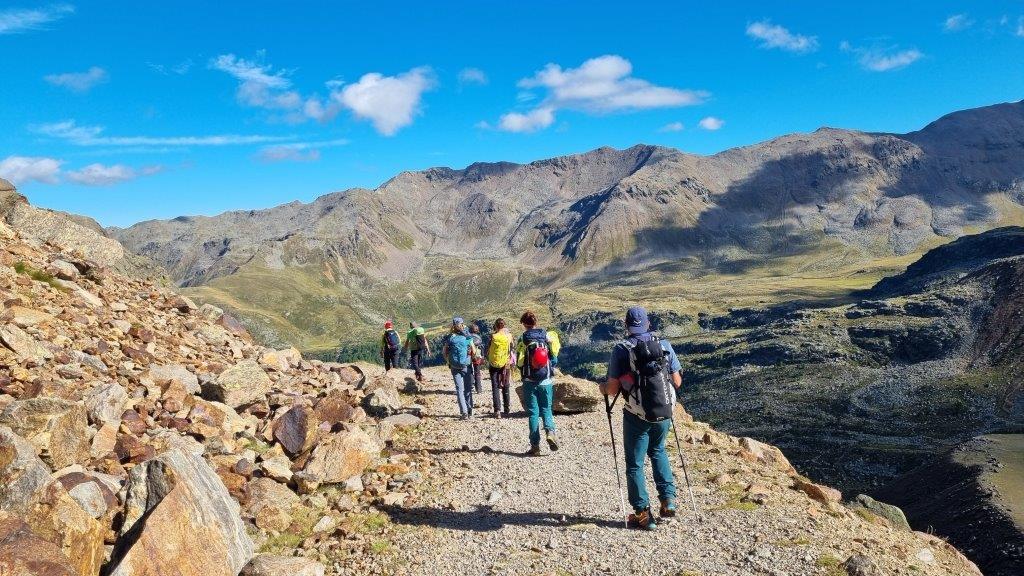 Dieser neue Steig führt leider nicht mehr über den Gletscher in Richtung Talschluss Ulten, da nur mehr Reste übrig sind, sondern schnee- und gletscherfrei zu einigen namenlosen Gipfeln und abschließend über die Lorchenspitze. Erst dann führte der Weg über die vom Gletscher freigegebenen Rücken und Kare, um Grünsee und Höchster Hütte und dann hinunter zum Weißbrunnsee. Beim Bergrestaurant Weißbrunn ließen wir unseren gelungenen Bergtag ausklingen, um dann mit Bus und Zug wieder nach Hause zu fahren.