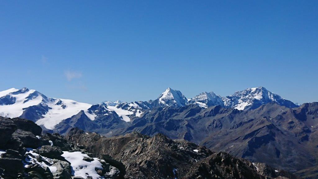 Nach einer ausgiebigen Rast am Gipfel wählten wir anfangs den Weg über den Grat, den wir jedoch wegen des Neuschnees bald verlassen mussten. Wir wählten nun den anfangs knapp unterhalb des Grates verlaufenden Weg, der im stetigen Auf und Ab unterhalb oder am Grat verlief. Die Sicht auf Brenta, Adamello, Presanella, Monte Vioz, Palon de la Mare, Cevedale, Zufallspitze, das Dreigestirn Königspitze, Zebru und Ortler, die Marteller Berge und Gletscher sowie Weißkugel, Langtaufererspitze und viele andere Berge war hervorragend.