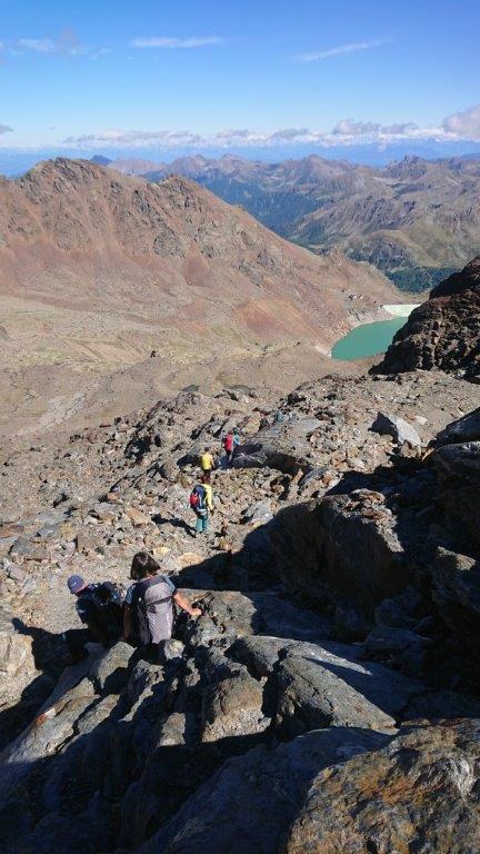 Am Sonntag ging es nun bei bestem Wetter und bald schon mit den ersten Sonnenstrahlen zum Sternaisee und dann, nicht wie bis im vorigen Jahr üblich über die anderen, weiter oben liegenden Seen weiter über den Gletscherrest zum S/W Grat, sondern ab dem 1. Sternaisee sofort sehr steil über den Rücken auf anfangs wenig sichtbaren Steigspuren und entlang der etwas spärlicher mit Steinmännchen markierten Route zum Gipfelgrat. Auf diesem konnten wir durch Legen eines Fixseiles die zwei ausgesetzten Stellen absichern, damit alle Teilnehmerinnen und Teilnehmer diese in Sicherheit meistern konnten. Nach etwas über 4 Stunden erreichten wir den Gipfel, wo wir auf eine Gruppe der AVS-Sektion St. Pauls trafen.