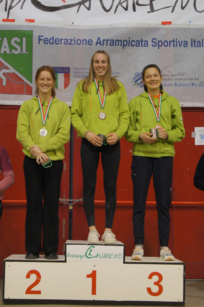 Lena Trojer (AVS Meran) für die U20, Elsa Giupponi (AVS Meran) U18, Leah Bickhove (Arco Climbing) U16, Chiara Franceschini (Arco Climbing) U14 und Nadja Ranalter (AVS Brixen) U12.