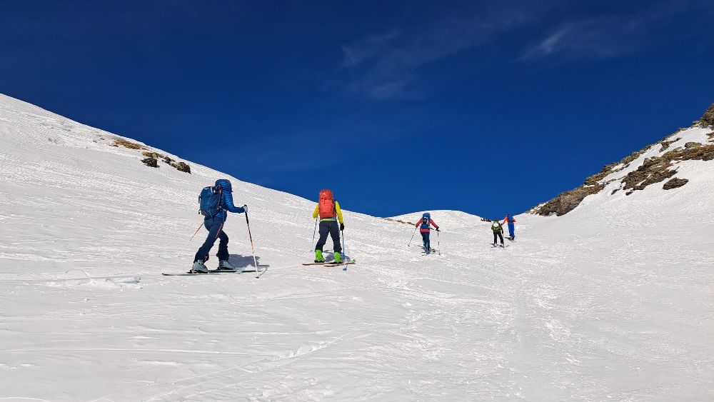 Das Gelernte aus den theoretischen Einheiten zu Karte und Orientierung, Schnee- und Lawinenkunde sowie Tourenplanung setzt ihr auf den Skitouren in die Praxis um.
