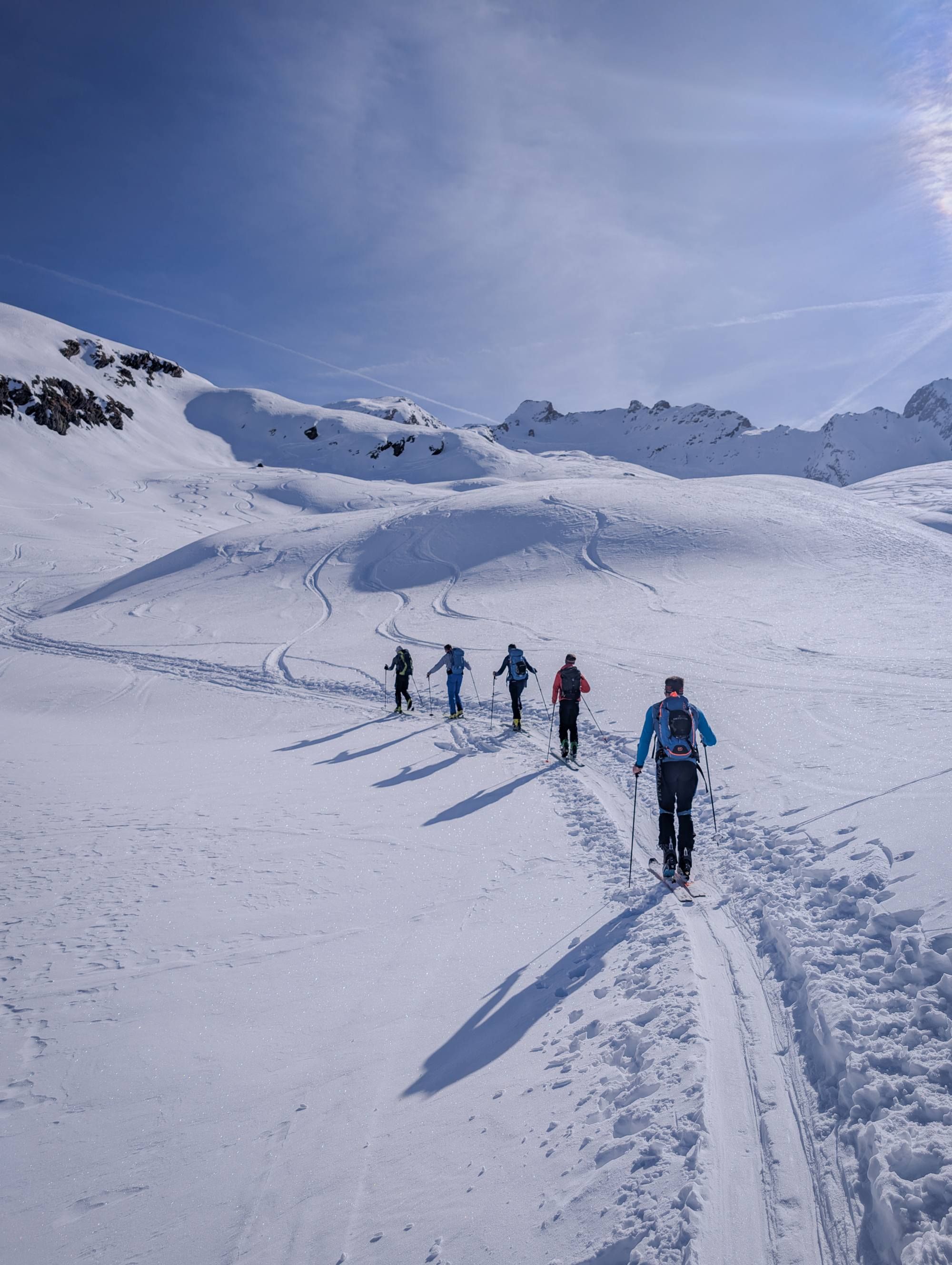 Samstag: Skitour mit Fokus: Interpretation Lawinenreport, Gruppencheck, Spuranlage, Standards im Aufstieg und der Abfahrt