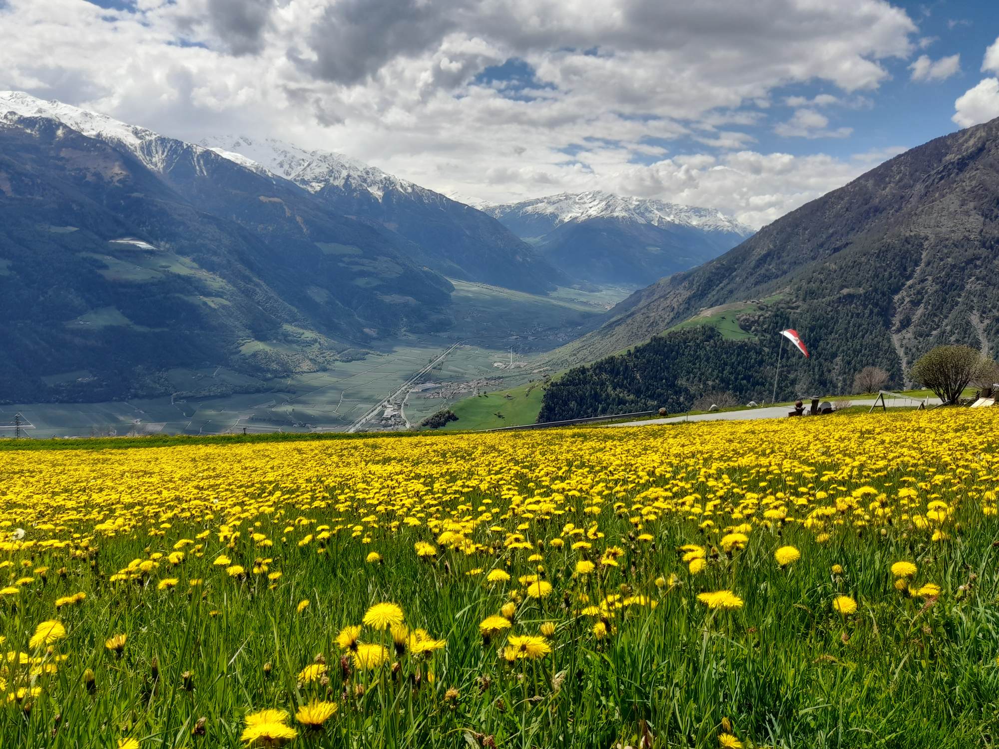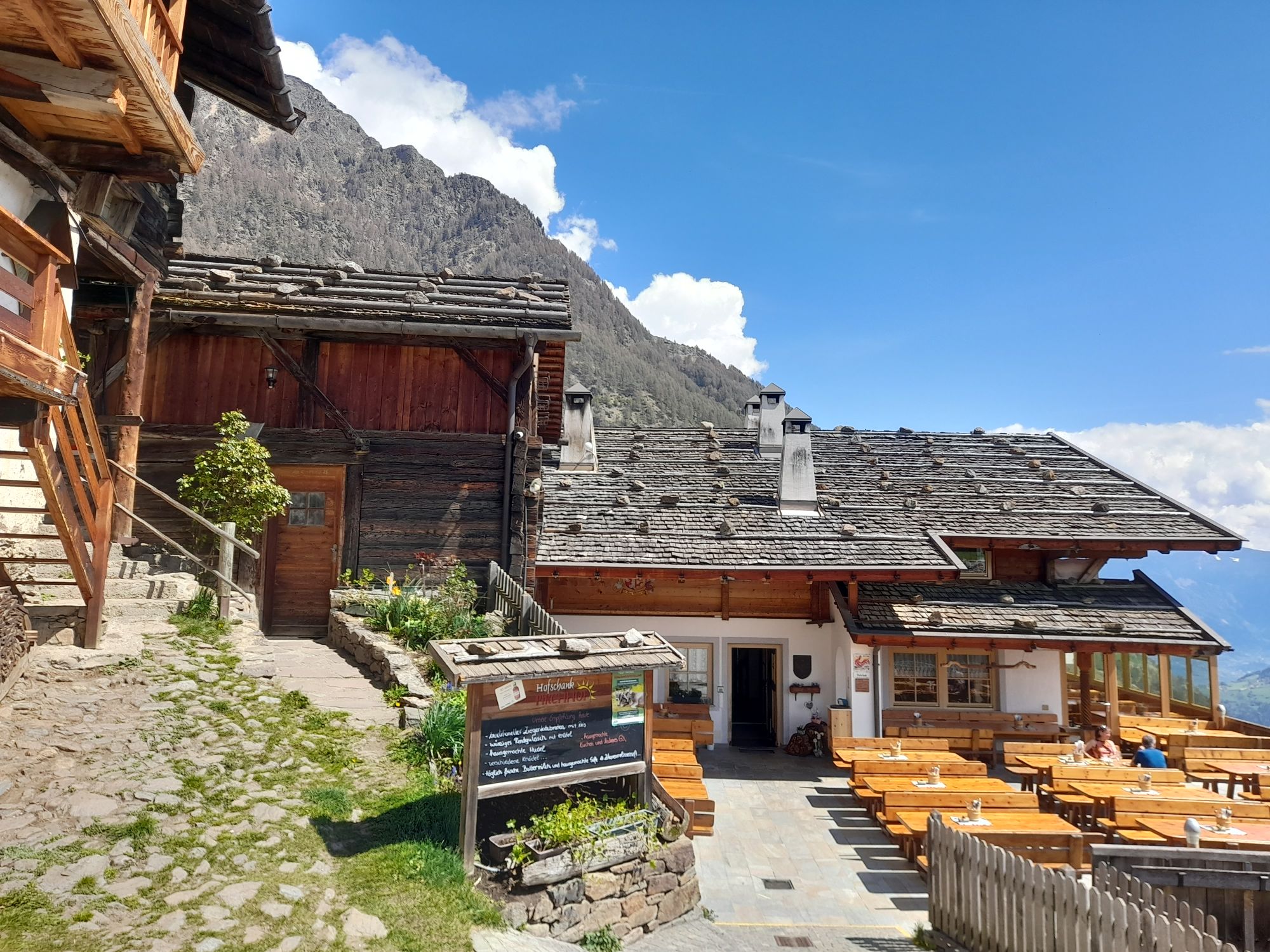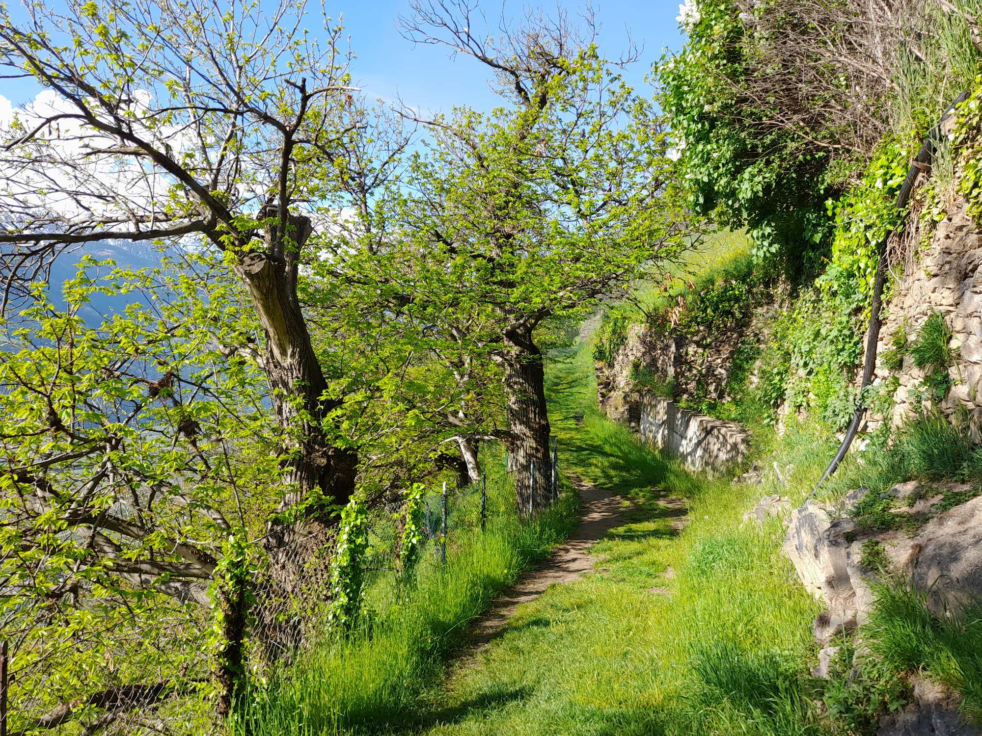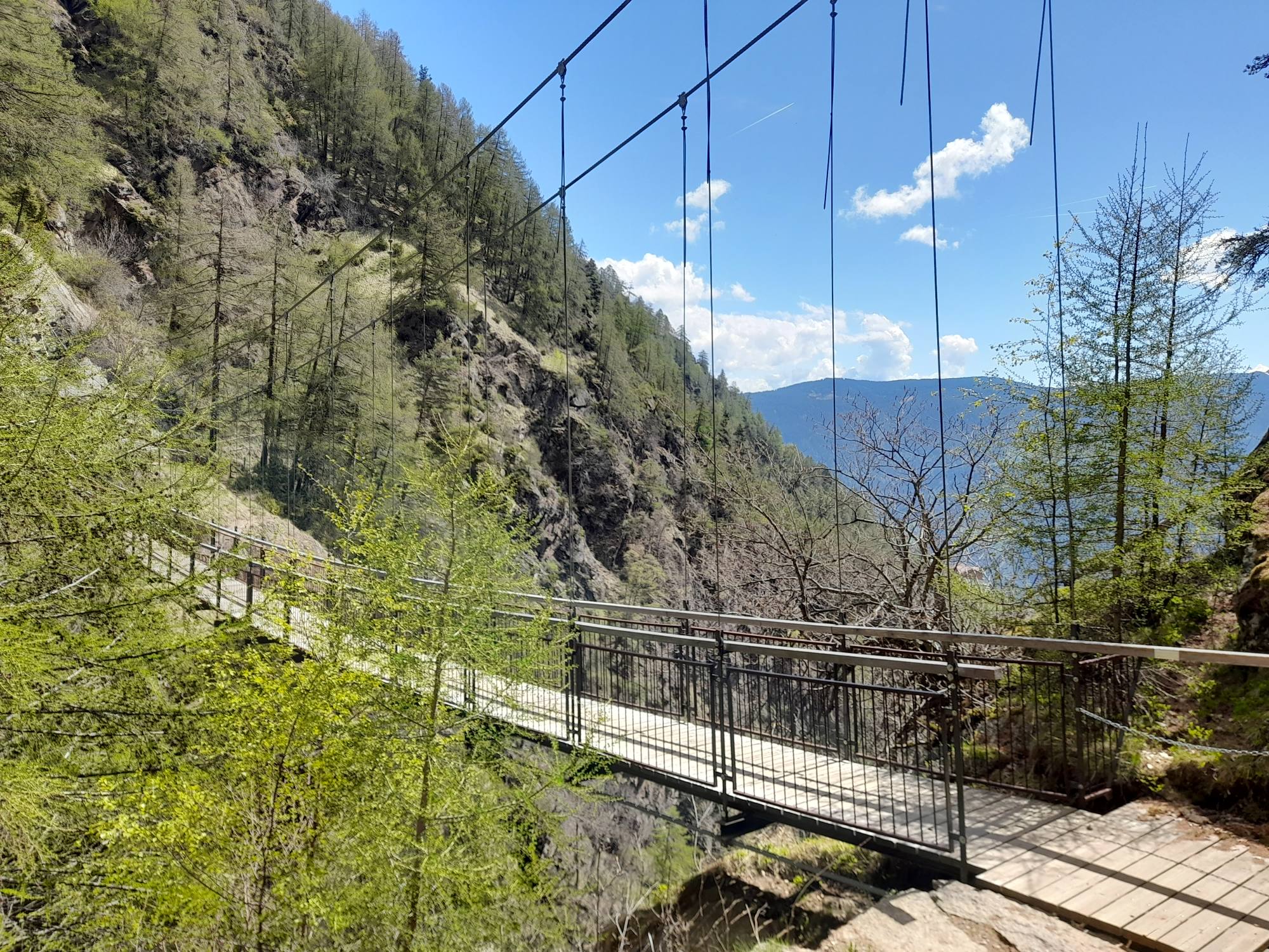 Beim Gasthaus Giggelberg treffen wir auf dem Meraner Höhenweg, der durchgehend mit der Nr. 24 markiert ist. Der Weg ist abwechslungsreich und führt durch Wälder, an Höfen mit steilen Wiesen vorbei und durch die 1000-Stufen-Schlucht. Diese wird mittels zahlreicher Stufen (ob es wirklich 1000 sind, habe ich nicht nachgezählt) und einer Hängebrücke überwunden. Da Steinschlag nicht ausgeschlossen ist, empfiehlt es sich, den Abschnitt rasch zu queren.