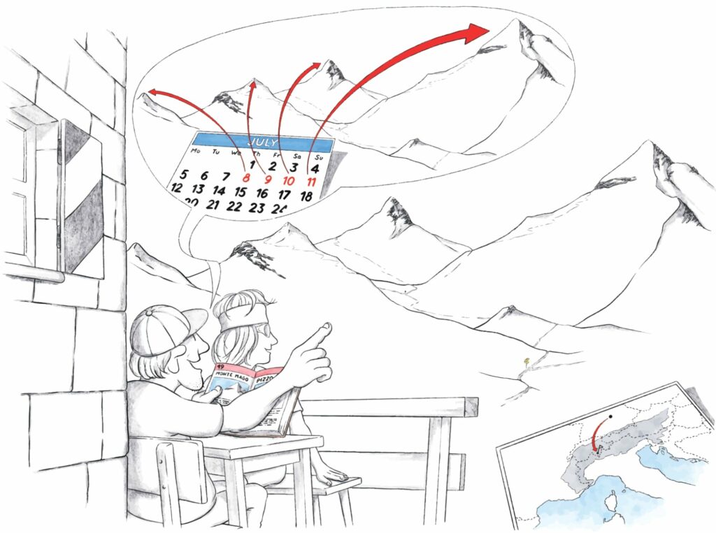 In den Bergsteigerdörfern mit gutem Gewissen und leichtem CO2 Rucksack unterwegs © CAA – Club Arc Alpin, Illustration Georg Sojer