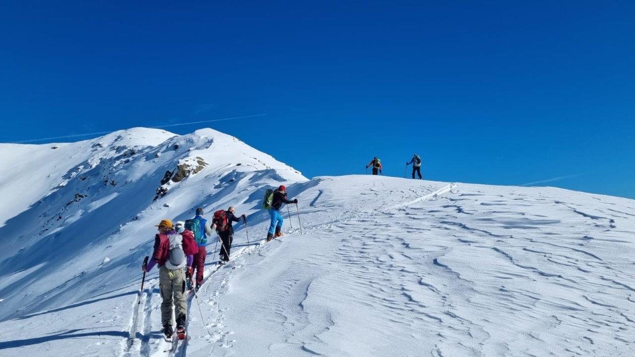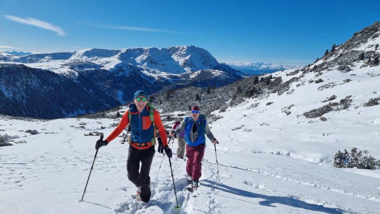 Die Landschaft war wunderschön verschneit und Reifplättchen glitzerten wie tausende Edelsteine in der Sonne. Nachdem wir diese weiten Almflächen Richtung Nord für längere Zeit gequert hatten, konnte wir unser Ziel gut erkennen. Das Plankenhorn ist über einen langgezogenen Kamm zu erreichen. Unterwegs gaben wir den Teilnehmer:innen einige Tipps zur Beurteilung der Schneedecke und luden sie ein, auf ihren Skitouren die vorgegebene Spur manchmal zu verlassen. Nur so erhalten sie Zusatzinformationen über die Beschaffenheit des Schnees. Auch nahmen wir uns Zeit, eine etwas vereinfachte Lawinenverschütteten-Suche durchzuführen.