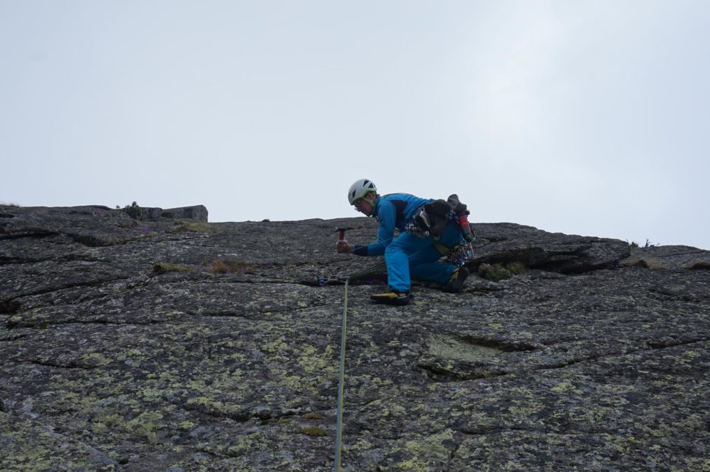 Bereits nach wenigen Klettermetern mussten wir akzeptieren, dass Reibungskletterei auf Flechten-überzogenem, nassem Fels ein Ding der Unmöglichkeit ist. Nur mit Mühe erreichten wir den Umkehrpunkt des ersten Versuches. In Anbetracht der Tatsachen war nicht daran zu denken, sich ins Ungewisse weiter zu wagen. Wieder seilten wir ab. Bis auf den erhöhten Fitnessgrad und drei geschlagene Haken hatten wir an diesem Tag nicht viel erreicht.