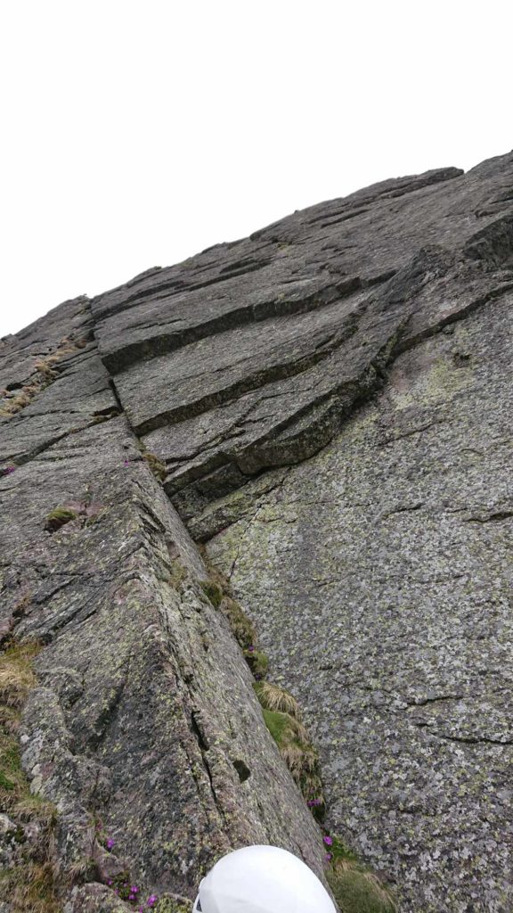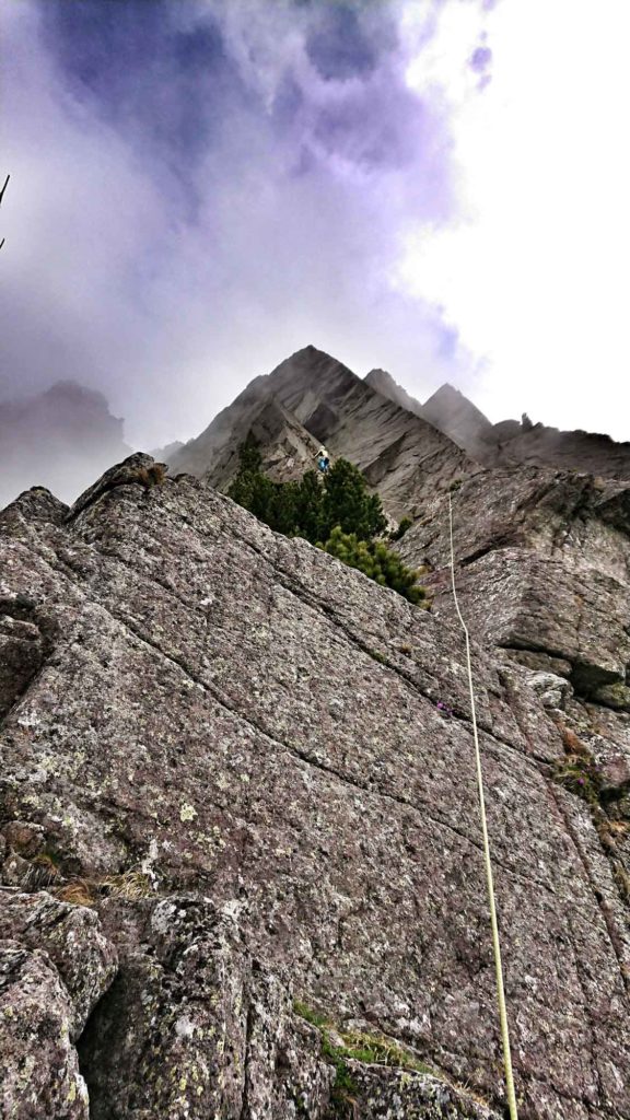„Tintl-Tantl, welches Handl“ entscheidete wie immer, wer einsteigt. Dieses Mal traf es Andy. Mit viel Speck, – äähm Besteck – an den Hüften kletterte er sich sehr sicher fühlend ins Ungewisse. Bereits die erste Seillänge (jetzt die 2. laut Topo) entpuppte sich als traumhaft schöne Reibungskletterei und begeisterte uns gleichermaßen. Der leichte Nieselregen machte uns nichts aus. Im Gegenteil: Er bestärkte sogar das Naturburschenfeeling, in das wir uns so gerne hineininterpretieren. Der Fels war noch einigermaßen trocken. Wir kamen gut voran und nach der 4.Seillänge folgte der lange Quer-Riss. Wir wussten, dass nach dessen Überwindung ein Rückzug nur noch sehr umständlich zu bewältigen sein würde und überlegten uns das weitere Vorgehen – wissend, dass am Nachmittag Gewitter zu erwarten seien. Nach dem dumpfen Dröhnen eines Donners banden wir uns schmunzelnd aus und bereiten uns auf den Rückzug vor.