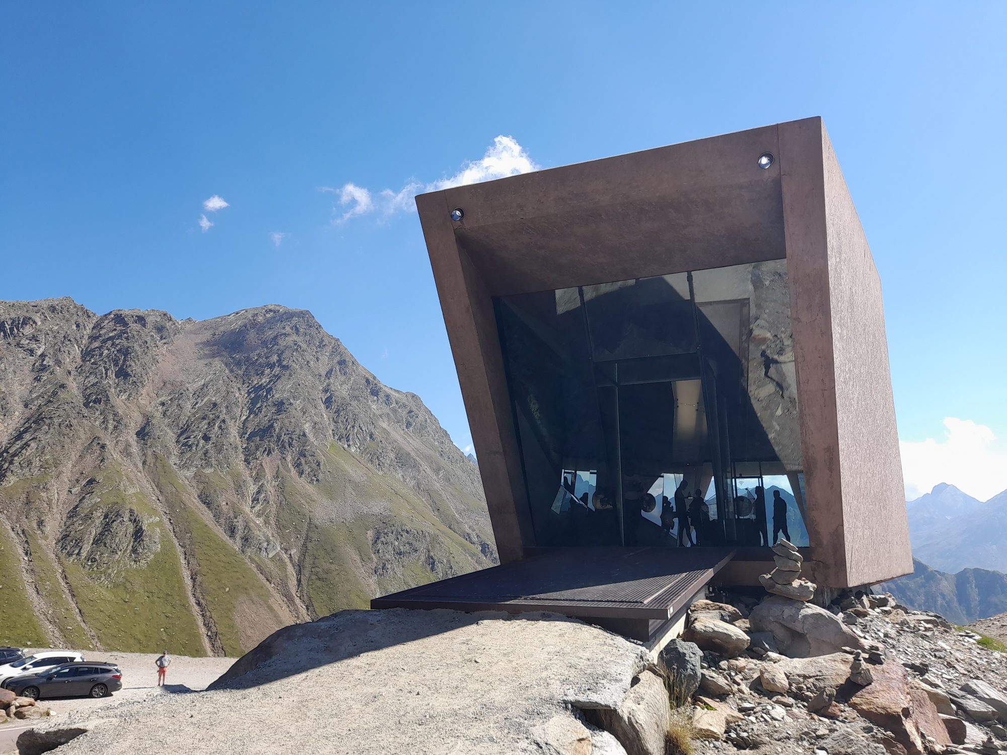 Die Anreise mit dem Bus ermöglicht einen entspannten Blick auf das Verkehrsaufkommen und verspricht eine Panorama-Fahrt über ein Meisterwerk der Ingenieurskunst. Am Timmelsjoch befinden sich Gasthäuser und verschiedene Installationen – ab dem späten Vormittag herrscht hier Trubel.