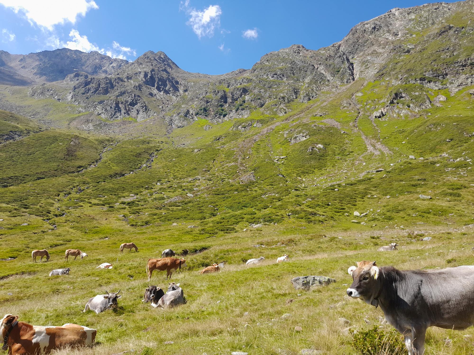 Das Timmelsjoch ist in den Sommermonaten Treffpunkt der Motorrad-Freund:innen, der Radfahrer:innen und zahlreicher Tourist:innen, die mit ihren Autos oder Campern die zahlreichen Kurven überwinden. Sie alle versammeln sich für einen Foto-Stopp auf den Parkflächen. Wir verlassen das turbulente Treiben daher rasch und nehmen unseren Weg abwärts durch das Timmelstal. Der erste Wegabschnitt ist steiler und erfordert etwas Trittsicherheit. Bbald öffnet sich das Hochtal, wird zu einer breiten Almlandschaft, in der einige Kühe weiden.