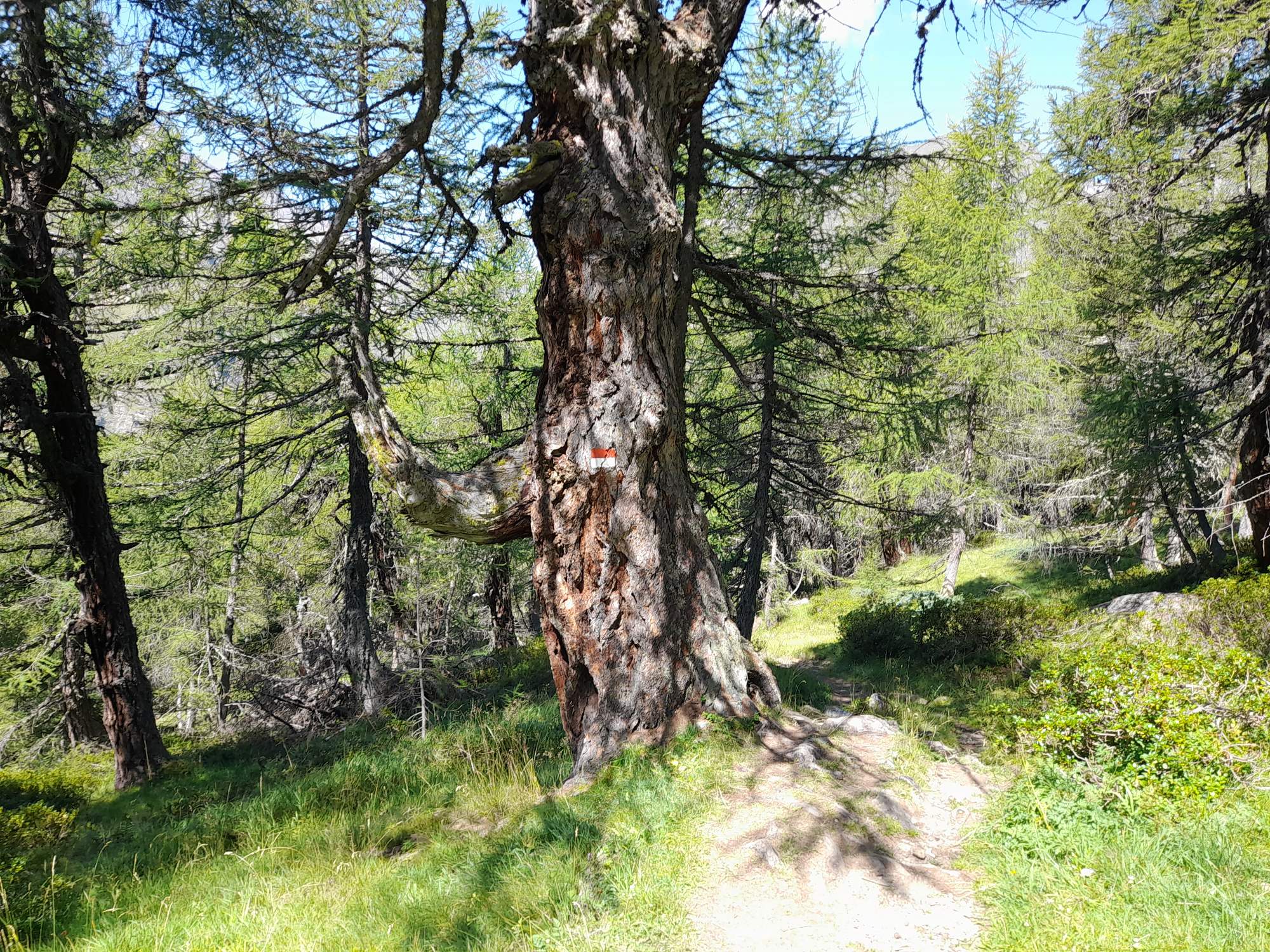 Es geht weiter abwärts, die Abzweigung in Richtung Gasthaus Hochfirst ignorieren wir. Wir gehen nahe an der kleinen Banker Alm vorbei (wo gerade eine Teil der Wiese rund um die Hütte gemäht wird) bis zur Timmelsbrücke (Bushaltestelle). Nun befinden wir uns wieder an der Timmelsjoch-Straße, auf der an diesem schönen Spätsommertag zahlreiche Motorräder lärmend entlangbrausen. Nach diesem Abstieg folgt ein Gegenanstieg, zunächst über einen breiten Zufahrtsweg zur Egghof Kaser und Tommele Kaser. Dann folgt ein steiler Anstieg durch den lichten Lärchenwald, Weg Nr. 29, auch als Knappenweg bezeichnet. Bald erreichen wir einen Höhenweg, der abwechselnd durch Weideflächen und Lärchenwald führt und dem wir bis zu schön gelegenen Oberen Gostalm (1.990 m Meereshöhe, Einkehrmöglichkeit) folgen. Für den Abstieg nehmen wir Weg Nr. 29B bis zur Timmelsjochstraße mit der Bushaltestelle Platterköfel (Moos i. Passeier). Rückfahrt mit den Buslinien 242 und 240.