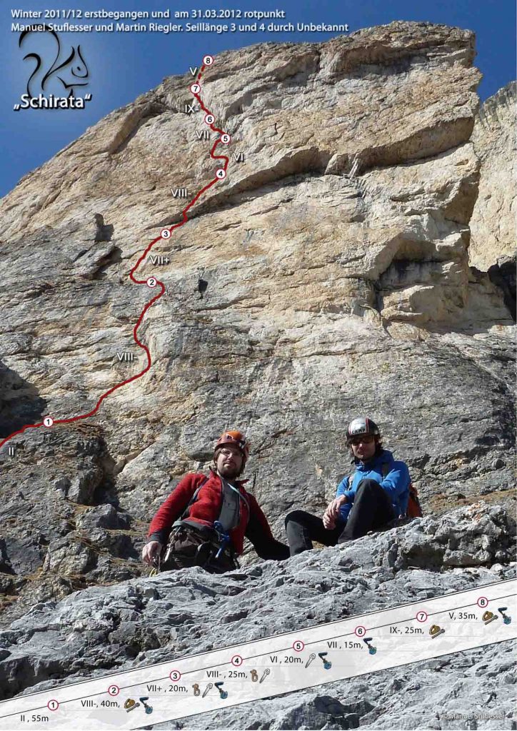 Erst am 9. März 2012 versuchen wir es erneut und erreichen diesmal das ersehnte Gamsband des Piz Ciavazes. Aufgrund der hohen Schwierigkeit einzelner Passagen werden diese während der Erstbegehung technisch überwunden, aber vor allem Martin ist davon überzeugt, dass es auch frei kletterbar sein musste. Ich fange an eine erste Routenskizze zu zeichnen und beim Betrachten des Bildes fällt uns auf, dass es noch genügend Platz gibt der Route einen eigenen Einstieg zu schenken und nicht wie bisher über die „Zeni“ einzusteigen. Gesagt – Getan. Die Einstiegseillänge ist bald geklettert und wir wollen die restliche Zeit nutzen, um die Kletterzüge der schweren Seillänge zu probieren. Martin ist unterwegs in der 6. Seillänge als er kurz vor dem Stand plötzlich zu mir runter schreit „A Oachkatzl (Ein Eichhörnchen)“! Ich schaue hoch und sehe wie es in der senkrechten Wand davon läuft. Wir fühlten uns etwas erbärmlich, deklassiert von einem Eichhörnchen welches mit Leichtigkeit durch die Wand läuft, wo wir nur schwerfällig mit kiloweise Material vorankommen. Eichhörnchen soll deshalb auch der Name der Route sein, auf ladinisch Schirata.