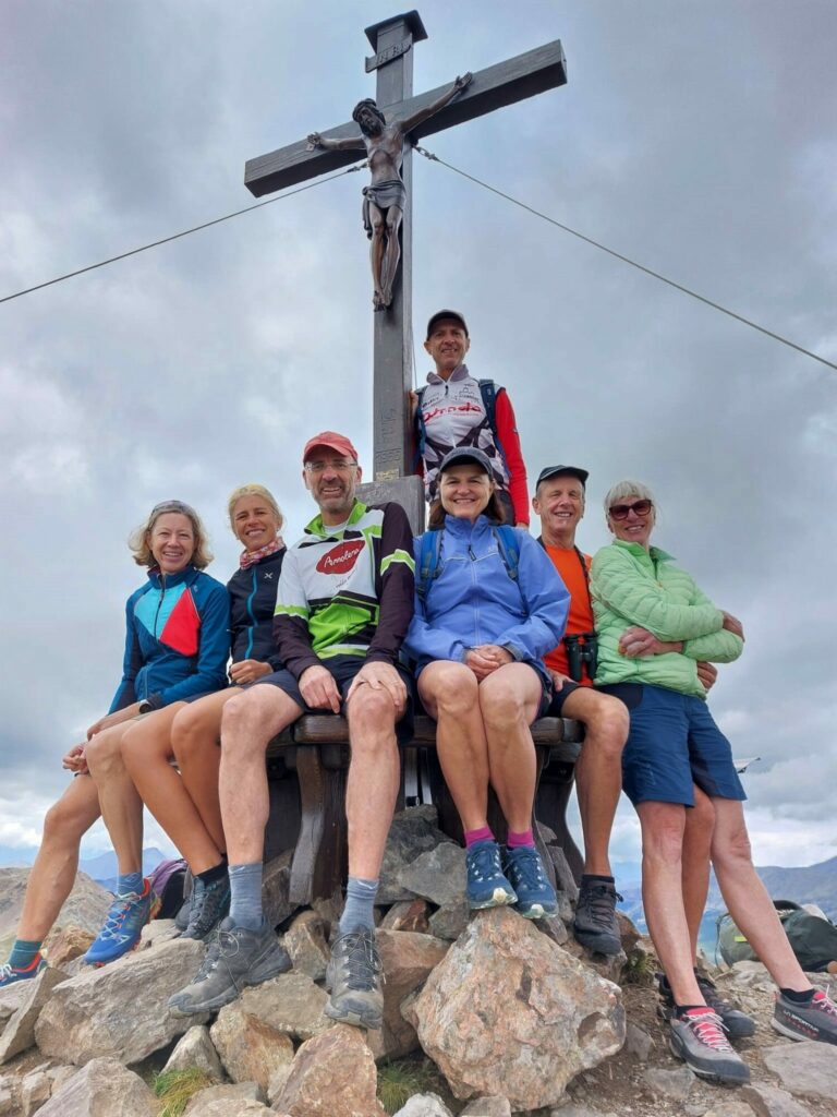 Mit E-Bikes ging es über den Saubacher Kofel zum Huber Kreuz, weiter Richtung Saltenstein und Mair in Plun, wo erstmal ein Kaffee getrunken und frisch gebackenes Brot gekauft wurde. Die E-Bikes wurden später am Ende der Forststraße nach der Stöfflhütte abgestellt. Von dort ging es zu Fuß weiter über das Latzfonser Kreuz hinauf auf die 2.581 Meter hohe Kassianspitze. Dort genossen wir unsere mitgebrachten Köstlichkeiten und das frische Brot. Die aufziehenden Wetterwolken verhinderten einen weiteren Aufstieg zum Samberg und so ging es auf demselben Fußweg zurück zu den E-Bikes. Der Rückweg führte uns über den Gasteiger Sattel und, nach einer verdienten Einkehr beim Feltuner, über den Rosswagen zurück zur Tann.