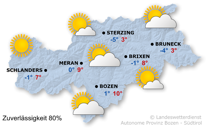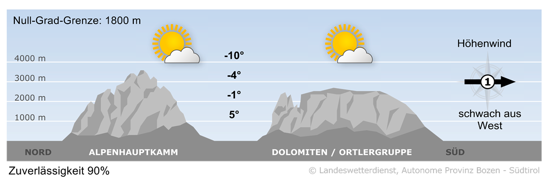 Auch am Sonntag abseits der Nebelzonen, die sich vornehmlich an den Alpenrändern im Osten und Norden befinden, sonniges Bergwetter bei wenig bis teils mäßigem Wind aus Süd bis Südost. Nachmittags vom Südwesten her Wolkenaufzug in hohen Schichten, der böige Südföhn nimmt entlang des Hauptkammes und im Norden in Föhnschneisen deutlich zu. Nur nach und nach zieht es vom Gardasee bis zu den Julischen Alpen am Abend zu, es bleibt aber überall trocken. Temperatur in 1500 m von 1 bis 7 Grad, in 2000 m von 0 bis 6 Grad, in 3000 m von -6 bis -2 Grad, Nullgradgrenze 1300 bis 2800 m. Wind in 1500 m von 0 bis 40 km/h, in 2000 m von 0 bis 30 km/h, in 3000 m von 0 bis 40 km/h im Mittel, stürmische Böen von 20 bis 80 km/h aus dem Sektor Süd.