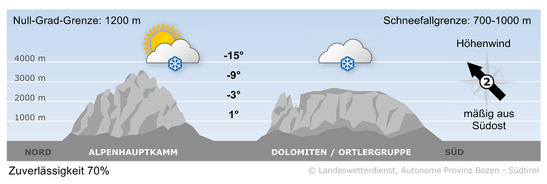 Im Tagesverlauf zieht es überall zu und von Süden her setzt leichter Schneefall ein. Insgesamt kommen aber nur ein paar cm Neuschnee dazu, am meisten schneit es entlang der Grenze zum Trentino und Veneto, sowie in Ulten.