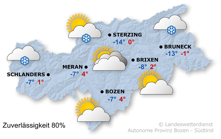 In Südtirol überwiegen die Wolken und an der Grenze zu Nordtirol schneit es zeitweise leicht, vor allem zwischen dem Pfitschertal und hinterem Ahrntal. Am freundlichsten mit etwas Sonnenschein wird es im Süden und in den Dolomiten.