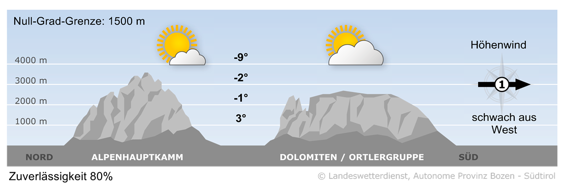 Auf Südtirols Bergen scheint oft die Sonne. Zeitweise ziehen aus Westen hohe Wolken durch, die am Nachmittag dichter werden. In der ersten Tageshälfte gibt es über vielen Tälern Hochnebelfelder.