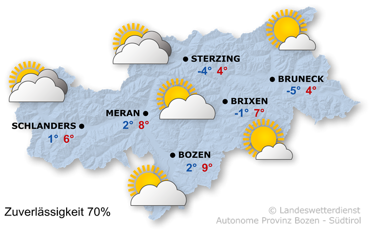 Der Hochnebel lockert von Osten her auf. Länger trüb bleibt es Richtung Vinschgau. Im Pustertal weht lebhafter Ostwind.