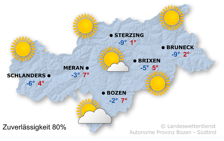 Am Nachmittag geht es in den nördlichen Tälern wie dem Obervinschgau und Ahrntal sehr sonnig weiter, sonst wechseln Sonne und Wolken. Gegen Abend zieht es überall zu und in der Nacht fallen stellenweise ein paar Schneeflocken.
