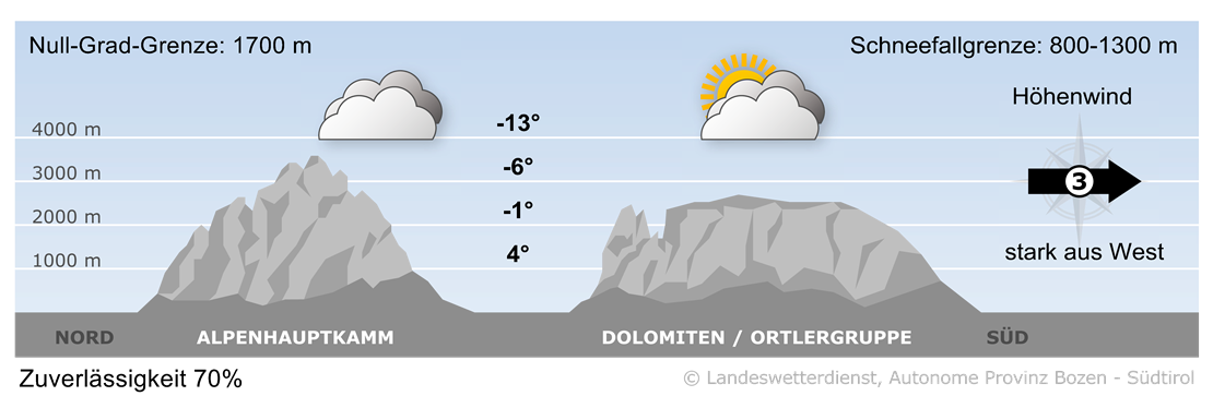 Wind in hochalpinen freien Lagen: In 1500 m von 0 bis 60 km/h, in 2000 m von 0 bis 70 km/h, in 3000 m starker Wind von 10 bis 50 km/h im Mittel, schwere Sturmböen von 30 bis 100 km/h aus dem Sektor Südwest.