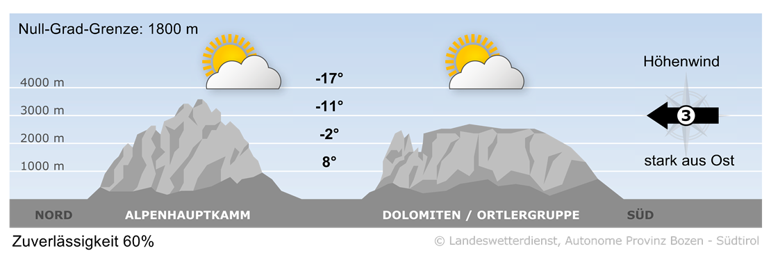 Der Tag verläuft wechselnd bewölkt. Längere sonnige Abschnitte gibt es voraussichtlich Richtung Westen, mehr Wolken in den Dolomiten. Im oberen Pustertal frischt Ostwind auf.