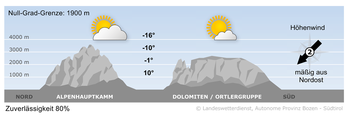 Wind in hochalpinen freien Lagen: In 1500 m bis um 20 km/h, in 2000 m bis um 20 km/h, in 3000 m schwacher Wind bis um 20 km/h im Mittel, Böen von 20 bis 50 km/h aus dem Sektor Nordost.