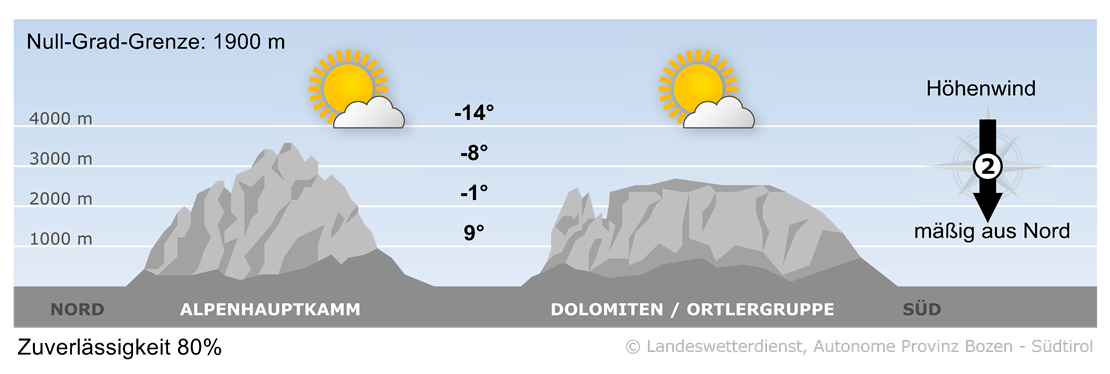 Nullgradgrenze: von 0 bis 2000 m, tagsüber ansteigend.