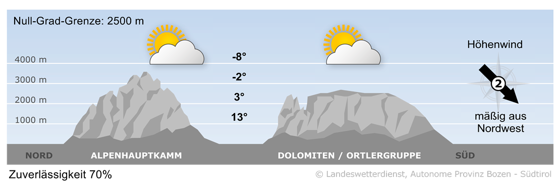 Wind in hochalpinen freien Lagen: In 1500 m von 0 bis 30 km/h, in 2000 m von 0 bis 50 km/h, in 3000 m von 0 bis 40 km/h im Mittel, stürmische Böen von 20 bis 70 km/h aus dem Sektor Nordwest.