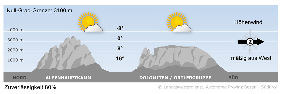 Wind in hochalpinen freien Lagen: In 1500 m von 0 bis 30 km/h, in 2000 m von 0 bis 40 km/h, in 3000 m mäßiger Wind von 0 bis 30 km/h im Mittel, Böen von 20 bis 60 km/h aus dem Sektor Südwest.